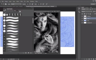 Hello and welcome back to Fantasy Digital Portraits. My name is Melody Nieves, and in this lesson we'll experiment with a lighting scheme for this portrait by creating three new thumbnails dedicated to light and shadow. If you're looking to be more experimental with your painting, then it's definitely a good idea to craft a couple of quick thumbnails to test out your ideas. Just like in chapter three, we'll use the original sketch to create three new thumbnails. To start, merge all the sketch layers together. Control+J to make a copy of the layer and create a new layer above it. Ctrl+A to select the border of the canvas and right-click to add a blue stroke of five pixels. Merge the sketch and border layers together and dock all your windows. Hit the print screen key just to get the dimensions of your screen in order to make a new document. In this case, mine is 1366 by 768 pixels. Copy and paste your sketch on to the new document and resize it using the Free Transform tool. Hit Ctrl+J twice to create two more duplicates and position them into place. You can create three backgrounds easily by using the Rectangular Marquee tool to draw selections around each thumbnail. Hold Shift to add each new selection so that you can fill all three selections in at once. Use the same blue color from the sketch to fill the selections in for a solid background. Now select a layer with all your thumbnail sketches and set it to multiply. This will help us be able to see the sketches much better. You definitely wanna take advantage of the fact that you have a photo manipulation as your guide, so bring back the window with your completed manipulation to help you paint the first lighting scenario. Select a nice solid brush with the transfer option checked and adjust the flow control to pen pressure. Since the color of the sketch is now darker than the background, hold Alt to pick that color up with the eyedropper tool and begin painting in your shadows. Start with the areas that you definitely know have the deepest shadows, then move upward in the value scale. Let the background color be the midtone value, so that all you need is a good highlight to understand where the light will be heading. Go to the Color Picker and select a much better value of that color range to add bright baby blue highlights to your thumbnail. Continue using your photo manipulation as a guide, but don't worry about making the thumbnail too perfect. Redock that window and move on to the second and third thumbnails. This time I want to experiment by reversing the lighting scheme. In this lighting scenario, the light is coming from behind, making my female character seem even more powerful than before. And although I really like this look already, I'm finding the shadows harder to figure out as I try to make them reflect the overall lighting scheme. Moving on to the third thumbnail, I start off with brightly illuminated spots for the face and hand. For the shadows, I pretty much revert back to the original lighting scenario, but decided to add a couple of more highlights that would be caused by the bright spotlights. A new adjustment layer for curves will really help to bring out the shadows and highlights for these thumbnails. So here are the final thumbnails. Which ones do you prefer, A, B, or C? There are things that I like about each one, but I think I'll have to eliminate the second from my choices. In fact, I feel like if I can get a balance between the first and last thumbnails, then I'll have the perfect lighting setup. Now that we've tested different lighting scenarios for our fantasy portrait, it's time to start painting. So join me in the next lesson, where I'll show you how to organize the base layers and commit to a final lighting scheme.
