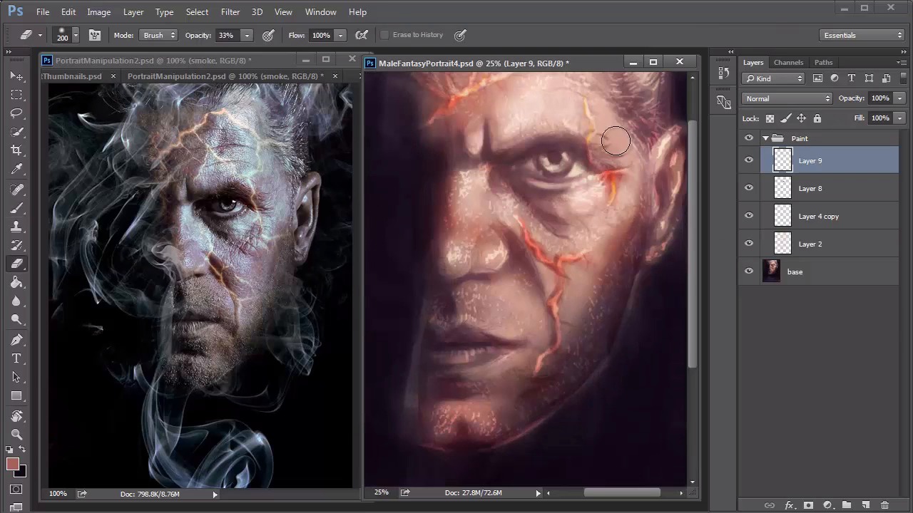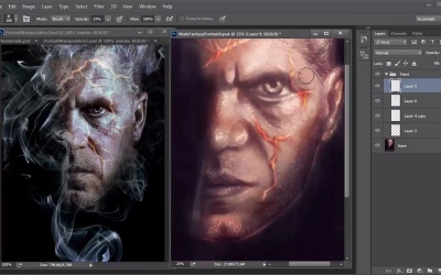 Hello and welcome back to Fantasy Digital Portraits. My name as Melody Nieves and this is the final lesson for chapter three. In this lesson, we'll continue painting the final details to our portrait and finish this painting off by adding the smoke. Before we start, let's take a look at the before and after of this painting. Despite having a base of simple colors, we were able to transition well into a more colorful painting. Now it's time to add the final details. If you want, you can save a backup file before the step, but merge all your layers together. Set a new layer to overlay and use it to add warm highlights all over the face. Since the eye area is bugging me a little, I'll quickly bring the portrait into liquefy to adjust it using the forward warp tool. And once I'm done, I continue experimenting with highlights until I'm happy enough to move on. I haven't paid too much attention to those fiery cracks across his face, so now it's time to give them some love. Add a new layer set to overlay, and paint light tan color along the cracks to make them pop. If you need to, use the Eraser tool to soften this effect. Continue adding highlights to the rest of the portrait. You can use the same color to add highlights to the hair and lights double. Because the layer is set to overlay, the color automatically changes depending on the area that you're painting. This creates an interesting effect, especially for the beard because the color change makes the stubble look more realistic. Vary the intensity of the stubble and try not to get too carried away. After all, less is more. Add shine to the areas of the face where you know the light is hitting the most. There is something about highlights that really make a painting instantly more realistic. Since he's an older man with a lot of wrinkles, follow the natural texture of his skin by making sure the highlights are short, squiggly strokes. Ctrl+J to duplicate the highlight layer. This instantly intensifies the effect. You can lower the opacity of the copy, but looking back, I wish I would've left it alone. Continue adding more detail to your painting. This is when you really have to pay attention to the wrinkles and texture of the man's skin. Draw the wrinkles first and use the eraser tool to soften them for a more realistic effect. I also decided to add a little more blue and red tones to the painting, by adding a new layer set to overlay. And experimenting with the effect. If you haven't already guessed it, overlay is a great blend mode for highlighting. I continue to paint with it by using the color white to add more shine. Last but not least, we can't forget the smoke. Initially I was upset at myself because I had painted dark colors over the smoke layer and merged all the layers together. Since I could no longer see the original path I needed to think of a new plan. But then I remembered that I saved this painting over multiple files. So all I had to do was copy and paste the original smoke sketch onto a new layer. After adjusting the size, I brought down the opacity to 25% and added a slight Gaussian blur with a radius of 40 pixels. The preset brushes in Photoshop CC have really been perfect for this portrait. So to paint the smoke I use the soft round pressure opacity brush that relies on my graphics tablet for the intensity of each stroke. I found that the key to painting smoke is to focus on the edges. Since the original sketch is blurred underneath, and act as a nice space for me to paint more details. Continue painting the smoke. Use the rotation tool to create fluids strokes so that your hand creates better, curvy lines. I pretty much relied on the photo manipulation to tell me how to paint the smoke. I decided not to experiment too much with this step because I didn't want to mess it up. With the smoke done, I know that I'm slowly drawing to the finish line of this painting. I added a new adjustment layer for curves to intensify the lighting scheme. And continue tweaking the painting with more details. At this point, I no longer need the photo manipulation as a guide, so I close out of it to move on to the last steps. I add a little more texture to the background by painting small white dots to break up the darkness and brighten the lighting of the smoke. Finally, I created a new adjustment layer for color balance to intensify the warm highlights and bring out cooler, mid tones. And that's it for this male fantasy portrait. I hope you've enjoyed following along and learning how creating a proper set up for your painting makes the whole process much easier. We are just getting started in this realm of digital fantasy art, so join me in chapter four where we experiment more for the next fantasy portrait.