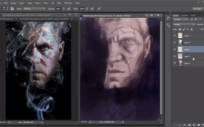 Time to add more colors! Transition out of your monochromatic palette and continue developing the shading and overall lighting of your portrait by incorporating layer blend modes into your work. Watch your painting transform to a color scheme similar to the original photo manipulation.