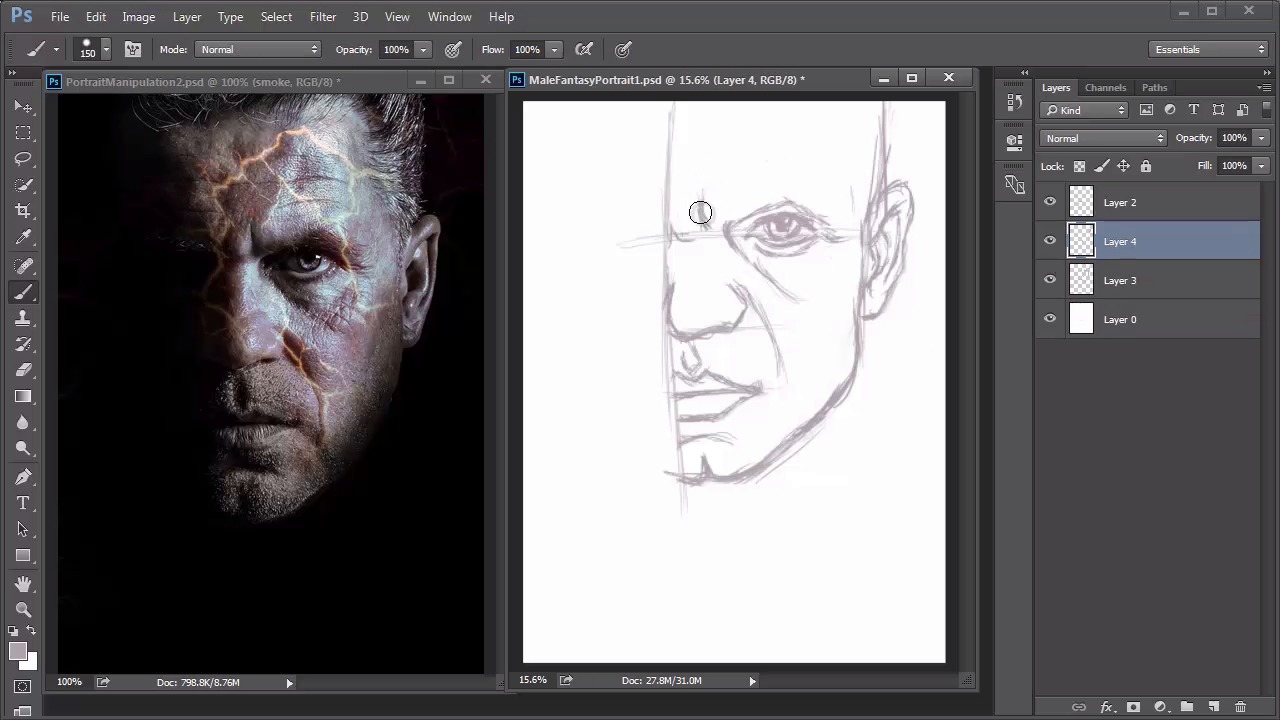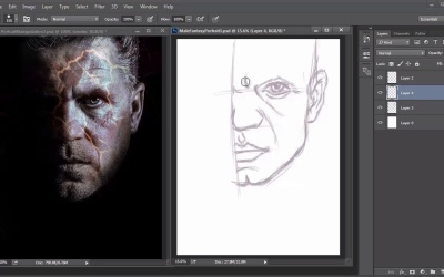 In this lesson, we'll draw sketches for the male fantasy portrait using Photoshop's Brush Tool. Starting with a rough sketch, we’ll use this as a base to create a much cleaner sketch before moving on to thumbnails.