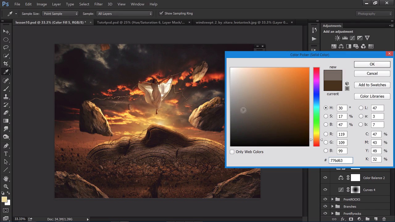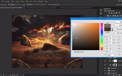 Hello. Welcome back to Lesson 11 of Creating a Thrill Scene with manipulation. In the last lesson, we nearly completed the color correction. Actually, we've just gotta do a few more things to finish it off. Now, I have done a few things in between the lesson. I just put these rocks ready for this lesson. They're exactly the same as the ones flying up in the air there. I sort of put these at the very front in our foreground to make sure that it finishes off the image and makes it look like there's some stains creating a bit of depth field. So I'm just gonna place these here. This one a bit bigger. Okay, and they're in their own group called front, so I'm going to call this front rocks. Finish it off, change this to normal. The layer start of the group. Bring up the brightness and contrast layer, bring that brightness down and the contrast down. At a color touch layer, you can merge these together to make it easier for us. Attach it to those rocks, edit, fill black. And then do the same thing we did with the other rocks. Color dodge get a nice cream color. The sun really low flow. I'm just gonna add in a bit of highlights. It looks like the sun is actually hitting it, like that. Okay, that looks really good. Add a overall one as well, it's a bit more lighter. Just round that off a bit more colorful like that. Okay, so now finishing off, do the color correction. So before we do anything else, I think it's a bit too orange. So I'm gonna add a bit more of the blue back in. So I'm gonna go to the shadows and add in more blue, like that. Now, I've, now I'm looking at it, yeah I think these front ones looking way too bright as well, I'm gonna add in even more. So another brightness and contrast layer. Darken these up a little bit. And on the color dodge layer, let's actually darken that a little bit as well. It's definitely a bit too bright. So hue and saturation. And choose the lightness layer here. And bring down that color there. It's a bit too bright, isn't it? So something like that. And new layer. Attach it, another layer. I'm gonna make it just completely yellow here. And just add a bit of yellow onto those rocks, cuz they look a bit dark. Something like that. Change the overlay. And then they're a bit more yellow now. Okay, looking good. So now with the general color correction again. Let's actually go back to that. What do I do? Make a new curves adjustment. Okay, I'm just going to go down on the bottom here. I'm going to go up on the highlights. So that's basically, the bottom is off to the shadows and the top is highlights like that. That's obviously brightened up the sun quite significantly. We're can go to our blue channel. Play around with that a little bit, add a bit of yellow or you get a bit of blue into there. Here's the red channel. And then add back in some of that red. Let's have a look what that looks like zoomed out. Like that, looks good. Okay, I still think it needs a bit more orange in there. Now that we've got little contrast looking really good, let's add in another solid color. And don't worry if you've got thousands of solid colors. Or thousands of adjustment layers. It doesn't matter in the end as long as the image looks good. Change this to soft light, our overlay. Wanna get this color looking perfect. So let's go over here. So, something like that I think. Zoom out. Lower down the opacity, and bring it back until it looks proper. Okay, perfect. I think that's it. So now that you've done your color correction, you want to finish off the image. There's one more thing you could do and that is a general 50% gray dodge amber layer. So Edit > Fill > 50% Gray. Change this to soft light. What you can do in here is just use the dodge and burn tool just to create shadows in certain places easier. So a bit more shadow in the front. A bit more shadows on this rock here, on this rock here, need more highlights on the mask. More shadows on this rock, that rock. Just a bit more easier than actually going through all the layers. A bit more on here there, bit more shadow work, through at the top. And finally, on the corners of the image. So, just darken up the image a little bit. Add a bit of vignette more, like that. Okay, perfect. So now you've done all that, just gonna finish it off with a little bit of sharpening. Let's close all the groups, like so. Make a new layer. Now this is gonna be, actually, destructive. So if you want to save it now. Ctrl+Alt+Shift+E and that makes a flat image of all of the layers underneath it. And I'm going to duplicate this a few times, so Ctrl+J, Ctrl+J. Hide these two layers first and this is gonna be a gentle sharp so go the Layersol, go to Overlay, gonna go to Filter, Other, High Pass. This one's gonna be 1. And that's just added a overall sharpness. As you see if I turn off and on, blurry, sharp. Now you can add a few of those if you want. So Ctrl+J, make it really sharp. Okay and then there that one's about 50% so as to increase the sharpness even more. Okay, so on this second one, I'm gonna go to soft light. Filter, Other, High Pass. This one's gonna be about a third of the way up. Or maybe a bit more than that, about half way. Okay, okay, so it's a bit a bit strange now, but layer the opacity down to 0, and bring it up gradually until you like what you're seeing. So just overall sharpness here. And the last one soft light again, Filter > Other >High Pass fully up to the end, okay, down to 0 on the opacity. And bring that to about 10%, a bit more than that. So that just increases the contrast slightly and even the sharpness a little bit as well. Okay, I need one more step, one more layer. Edit > Fill > 50% Gray and now you can add noise to this. So change this to soft light. Add in some grain to the general image. Let it Filter > Noise > Add Noise. And then add as much noise as you want. This basically looks like a film poster. In fact it is, but it just brings all the image together. Makes it look more like it's in the scene. So I'm going