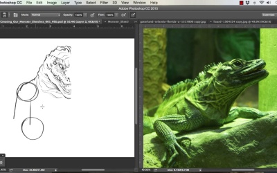 Welcome back to How to Create Monster in Adobe Photoshop brought to you by Tuts+. I'm your instructor today, Robert Marzullo. We'll now be covering lesson 3.1, Studying and Sketching From Reference to create our creature design. Okay so now we're going to go and work out our forms and our sketch lines to give us a reference point to start painting. So what I like to do, if you notice here I've got some ideas that have already worked out, added some effects to, and these all pretty much started the same way. A very loose sketch, or very blocked in shape or series of shapes that I would work up to these forms. But to do that I always start with some kind of reference. Just ideas really, just to look at stuff and gain perspective on a variety of animals and then distort those animals into some kind of monster design. So I really recommend doing that. I don't recommend tracing a whole lot, it's not a bad thing, you can trace elements if you need to, but if you practice enough you won't need to. So you can simply set up your screen like this where you have a divider window. I like to put my my work sheets over here, or my canvas. By the way, just so you know what I'm working at, you go to image size. First, make sure I'm on the canvas over here. Image size. This is a seven by 12 and a half, approximately, 300 dpi. I'm more into image size. I make sure that the image is big enough where I can get some good line clarity and paint clarity but then also that it's not such a large file that my system can't handle it. So that's where I'm at right there and as far as just looking at reference. I get a variety of things, I look at alligators. They've got some great forms and the reptilian features are awesome. Dinosaurs are great, obviously. Elephant skin, great for texturing. Rhinos and just a variety of lizards. Lizards have some of the neatest features and monster-like qualities already. So it's real easy. And I think the smaller ones, like insects, are great too because not everybody is so used to looking at them up close. So that in turn almost resembles a monster in itself. Because by the time you draw it, since people aren't so familiar with it, It becomes alien and monsteresque to them cuz they're not used to seeing it in such detail. So this arm off the praying mantis is just a really good example, I really like that look. So I'll work off these reference shots here and then I'll draw onto the screen over here. I'll the time lapse this next portion and narrate over top. So let's go ahead and get started. Okay, so now I'll just study from this reference and start to sketch out my line. And notice I also selected the shape dynamics on this brush to get more of a point in a pencil kind of look. So first in notice that like the eye from this reptile. So I obviously change the angle and start to draw that in. And then I also liked the ridges in the spikes from the T-Rex, so I'm doing a little bit of that as well. And now I'm studying the mouth from that one, but then I quickly want to go to the alligators because I really like, and I'm not sure if this an alligator or crocodile ,but I think it's alligator. But just the mouth shapes from these creatures are amazing. So I study that for not only the shape of the mouth, the opening, but also the teeth and I change the teeth a little bit. I put some on the inside and some on the outside Again, just another way to give it more of a monster-type quality. And just loosely sketching in some of the shape of the overall head, and I'm still figuring it out. Now, one of things I want to make sure I mention to you is, wWhen you're in a rough stage or rough sketch like this, be very open to change. If you keep it very loose, messy even. I would err more on the side of a messy, haphazard sketching than a clear and concise line work at this stage. The more I draw this stuff, the more realize that trying to be too concise in the beginning when you're designing a character like this will really stagnate your creative process. So just be nice and open to change and. When you see me flipping through these pictures of the various animals, that's what I'm doing. I'm just thinking about what area of that animal would look good into the sketch. And I'll just rough it in to see if it works. If it doesn't, no big deal. I didn't spend a lot of time, an absorbent amount in any one area. So I like more of those spikes in those cranial shapes in there. And here I'm cutting the image in half, or cutting part of it away, and I'm showing you the direction that I've been sketching in with that arrow that I just had there. But I'm also going to flip this and combine it to see if the these shapes are working. And here I actually like the neck from that reptile, so I want to incorporate a little bit of those folds in there. And then I start to try to work out the arms. Arms can be tricky. I'll try to work the neck down further and then work on the arms and there you see me flipping it and combining it, which can be a really neat effect to not only save time but see if your design's working out in a symmetrical fashion. But, yeah, again, back to the arms, they can be tricky, because we're so used to drawing arms on people, and you can see that the reptile arms work completely different. So, you want to make sure that you get that bit of monster quality into the the arms, because if they look just too traditional then it won't have the same effect. And you see I'm just flipping through the photos here. I'm basically trying to again, gain perspective. I'm looking at those photos and studying some of the arms and seeing which ones stand out. And obviously I end up gravitating towards the one I like the most and that's the arms of the praying mantis. Very unique and obviously recognizable, one of the more recognizable insect arms. So one of the things I do right there is I add a little pincer at the bottom. I try to play with the shape of the overall arms, I had a bit more of an elbow pe
