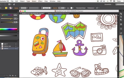 Hello everyone, and welcome back to how to doodle vector art course with Yulia Sokolova at tuts+. In this lesson, we'll be using the live paint bucket to color the outline vector shapes fast and easy. Let's see how we can do it. Here we have our outlines on a separate layer. Let's copy this layer and hide it for now. Select everything and go to Object > Live Paint > Make. Now we need to take the live paint bucket tool. Let's select the fill color in the color panel, And start coloring the suitcase. Just hover your mouse over the area that you want to color, and as you see a thick selection around it, click to fill it with color, easy as that. Change the field color in the color panel and continue coloring the suitcase. Apply a darker yellow color to the sides. And fill the handle with a nice blue color. Don't forget to color the stickers on the front surface. And now let's color the next element, a boat. Take the eye dropper tool, shortcut i, and let's pick the nice yellow color from the front part of the suitcase. Switch back to the Live Paint Bucket shortcut key, and fill the sail of our boat. Now you can easily switch between these two tools, the Eyedropper tool and the Live Paint Bucket by pressing the I and K keys on the keyboard. And this way you'll be able to pick the colors from the one object and then apply them to another object. Let's apply the colors to all the elements of our boat. Continue picking the colors and applying them to our doodles. After you've picked the color with the Eyedropper tool, you can adjust it in the color panel, changing its saturation, brightness and so on. For these elements I use bright, vivid colors which remind me of summer time, traveling, adventures, and which represent the theme of my doodles in the best way. I'm not using any special resources or tools to create my color palettes. I just pick them by guess and see whether I like the selected color combination or not. You can try using photos or images that you like, or that are corresponding with the topic as references and try picking the colors directly from there using the Eyedropper tool. If you like this particular color palette that we used in this part of video, you can get it from the source files to this course. I've included it there for you as a pilot document with all the colors in the swatches panel. Now as we colored some of the elements, let's see how we can continue working with them. We still have all the elements united into a live paint group. Let's turn them back into separate objects. Go to Object > Live Paint > Expand. Now if we ungroup everything, we can see that we have all the shapes messed up together. And apart from that, the outlines are broken into separate pieces. Let's fix it. First of all, open the Magic Wand options panel and make sure that the fill color tolerance is set to zero. This will allow us to select the objects of one of the same color. Now take the magic wand tool, select the brown outline and delete it. And that's why we've made a copy of our outlines at the very beginning. Remember? Make the lines visible again and let's unite the elements back into groups. Use the selection tool and Ctrl+G keys to select and group the shapes. And we can also use the magic wand tool to select the same colors and then add them from the color panel, making them lighter or darker. Color all the objects up to the end. You can make another copy of the outlines that we haven't called yet, and then use the same technique again. And that's it. Great job guys. We learned to use the live paint feature of Adobe Illustrator. And now our doodles look really vivid, colorful, and almost completed. Let's move to our next video and see how we can combine the elements, turning them into groups, and creating some fancy cards and templates. See you in the next lesson.
