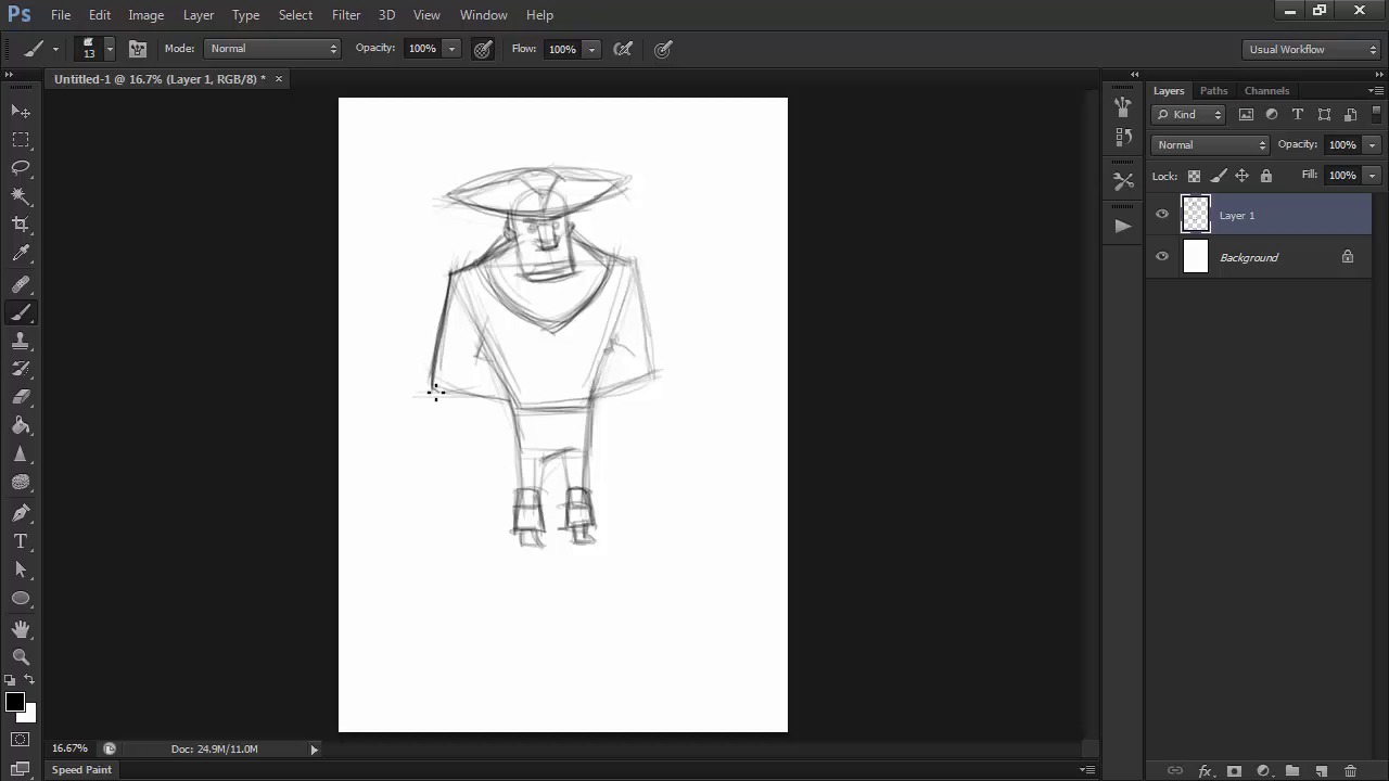 Let's define our character further by developing one of our earlier thumbnails into a rough sketch of his anatomy and costume.