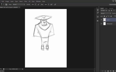 Hi, and welcome back to Illustrating Personality in Character Design. My name is Loana Sopov, and we are on our way to creating an awesome pirate captain character. This is chapter three, lesson 3.2, detailing the figure, in which we'll work with what we've established in the previous lesson about our character's figure and pose to create a more detailed and larger version. Let's get started. First of all, I'll be working on an A4 size 300 DPI wide file, just like with our previous character, and using the same sketch brush tool preset that we've used in the previous lessons when sketching. Working at a high resolution is great, not just for print but also getting a lot of getting a lot of details in the art work when working in Rastor. At this point, we already know what we want our character's general look to be like, so let's just start off with a simple ball shape to create the head. This method is derived from Andrea Loomis' technique of drawing the human head. Based on the observation that the top part of the head can be reduced in it's basic form to a sphere with the sides cut off. I know my character needs a boxy shape for the head in order to fit his hardy masculine personality. So, I'm going to use a rectangular shape for the lower part of his face. We want our character to have a big broad nose and tiny eyes to go with his protruding chin. Strong thick eyebrows and tiny ears complete the look we're going for. Don't worry about adding too much detail. Just focus on the general proportions and shapes of the features. We'll get around to detailing them in the next lesson. Next come the shoulders. I draw a line from shoulder to shoulder to establish the width of his upper body. His shoulders should be connected to his neck, even if we're not drawing or showing his neck because it's short or concealed by his long, boxy face. So, connect the points of the shoulders to the head using slanted lines. Like we've established in the thumbnail version, we want his body to be like an upside down trapeze to emphasize his more intimidating figure. Because I'm using a lot of lines until I find the ones I like the most, I'll just use the eraser tool to erase some of them and try to make the sketch cleaner. Remember, we'll need the sketch to be as understandable as possible for the next stage of detailing. Moving on towards the waist, let's use some more contrast in the relationship between proportions and shape to give him a shorter, thinner pair of legs compared to his body. Try to maintain the same boxy, almost rectangular shapes for his legs as well. As we are interested in keeping the language of the shapes we use constant throughout his design. His arms will go behind his back just like we planned in the thumbnailing part. The arms will be thicker than the legs, part of the same typical muscular, masculine silhouette. And even though elbows are not really sharp in appearance in real people, we'll go with an exaggerated sharpness to add to the overall impact that we want. For the hat, we might have to change this a bit. But that works in our favor here, because the hat is not part of his body, and the contrast between sharp and curved lines will create an interesting silhouette overall. A typical pirate hat looks almost triangular, because of the three folds that come together to form the top part. Two of them meet in the middle of the front part, and the third fold connects the two in the back. The center will be a half sphere between them where the head would be. While we're here we can't have a rugged pirate captain without a beard, so lets go for a shape that will compliment the ones we already have in his body. The beard will overlap with the shoulders and taper off towards the bottom. This shape will not affect our silhouette, and will only compliment it. I'll go over a few lines again to make them stronger and thus more visible and then I'm going to start thinking about his clothes for a bit. Pirates wear all sorts of clothes. But I want this one to have a longer coat, so that he has more of a captain's costume. I'm going to balance out his figure with the shape of the coat that will become wider towards the bottom. The bottom of the coat will end in sharp angles as well to contrast with the curved back of the coat. Because his coat is open, the edges will move away from his body to obtain that opposite shape to balance out his figure. I'm also going to change the position of his foot because of this balance that I'm trying to obtain. So I'll redraw it facing in the opposite direction. His hat seems to be missing something, so I'll add a huge feather to complete it. I'll check the position of his feet by drawing a straight line between them, just to make sure they're on the same level. Holding the Shift key pressed while drawing, will get you a stick straight line, to verify the level of your feet. He could use a belt of some sort and a diagonal belt as well to act as a holster for his weapon. After sketching out these ideas in our figure, I think that his head is a bit too big. So using the lasso tool to select it and then press Ctl+T to get the transform tool and to reduce it's size as well as shift it's angle to better suit the pose I am going for. This stage of the character's development should be entirely focused on getting the proportions right. So take your time and don't avoid changing what you don't entirely like about your character. Feel free to try different things in this stage just like in the previous thumbnailing one. The only difference being that you'll be working on this idea alone and not trying to come up with at least three different ones. This is why you shouldn't really pay any attention to creating quality in your line work at this point, and just enjoy the freedom that this part offers you to explore your options for the character's design. Now, I'm not entirely happy with the pose that I got because it seems a bit rigid since we've been using these boxy, s
