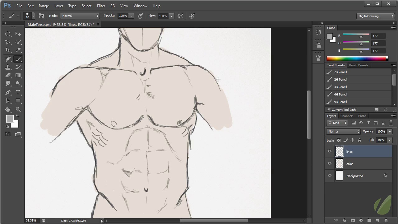 Tips and techniques for drawing the chest, midsection and hip area. Discussion over the differences between male and female.