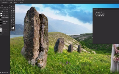 Welcome back to Introduction to photo Manipulation in Adobe Photoshop. In this lesson we will be covering the shading and the lighting using adjustment layers, layer mask and layer modes. This is when having a drawing tablet comes in a bit handy. It doesn't need to be big, fancy, or name brand. Any drawing tablet will be better than none. However, if you don't have one, that doesn't mean you can't paint, so do not worry. I'll be giving some non-tablet tips and tricks as we go. So first, let's start by lighting our subject's hair. I'm going to create and clip a new layer into the model here, setting the layer to Overlay and placing it above our grass layers. Now with a tiny two pixel brush, I'm going to paint white on the outermost hairs, as well as the highlights of the hair. When painting hair at this stage, you want to keep your flow rate low, sometimes as low as 1%. But typically, anywhere from 10% to 40% is the sweet spot. All the outermost hairs and flyaway should end up being basically pure white. Go ahead and keep your brush nice and soft most of the time, and you can go ahead and increase the size to add any larger blooms of light, always keeping the environment in mind. For instance, she is more lit on her right side than her left. So let's focus the lighting a bit more here. Once we are happy with the first layer of light, we are going to repeat that step. Only this time on a new layer set to normal. We're going to paint a solid it then white hair strands using her natural hair as a kind of guide. The reason a drawing tablet helps so much in these two steps is because of its ability to apply pressure sensitivity which is what is giving us these tapered edges here. There are a couple of ways to get these without a tablet however, my favorite being using the smudge tool. Here, we have painted a line using just a mouse, so it's blunt with harsh edges, not too terribly hair like. Let's select the smudge tool and crank it up to around 55%. Now, let's smudge out both ends of the brush stroke. The only downside of this method being that it won't be as quick compared to just being able to swish and flick with a pen on a tablet, but it will absolutely get the job done. Now on to our first Curves Adjustment, clipping it into our model. Curves layer works by placing points along the diagonal line here and then pulling either up or down. Pulling down will darken while pulling up will lighten. For this curve, we want to just slightly lighten our subject. So let's place a point right about here and drag up just a tiny bit. Now, let's fill the layer mask with black by selecting it and hitting control I. Which is inverting the white to black. Now, let's use a soft round brush to mask back in the light just around the edges of the subject. Being careful not to let the light go too inwards but still keeping a smooth gradient. Next, to the shading. For shading, I like to use a mix of brightness contrast, and a curve adjustment layers along with a layer set to multiply for more advanced shading. For this piece, let's stick with a brightness contrast and curves layered for now. Create and clip a brightness contrast layer to the subject. We are setting it to a negative 32 brightness and a negative 17 contrast. We're going to use this layer to darken the back of our model giving her more dynamic lighting. Click on the layer mask and hit Control I to invert it. Using a soft, round brush, let's mask in the adjustment layer, focusing on the middle of the subjects back here and also the head and the legs. Finally, we can finish up at the woman for now by creating and clipping a new soft light layer inside her and using a black soft round brush to deepen her shadows even further. Remember, keep that flow rate and nice and low, so you can build up those shadows. You guessed it, slowly, around 5 to 10% should do and if the shadow ends up being too deep or dark, you know, go ahead and bring the layer capacity down a notch. Now on to the stones. While the stones will require what seems like a million layers, we will be using the same general techniques and tools we did for our model. So let's create an clip a brightness contrast layer and to the stones bringing the brightness down to a negative 100 and the contrast down to negative 150. Now, zoom in nice and close on the rocks and using a semi hard round brush, mask the face of the stone and only the face here. We want the shading to be located only on the sides of the boulders. You can also use the shadow to shape your rocks a small amount, keeping in mind what areas the sun would and wouldn't be hitting. So when we are all done with our shading, we can now do some color correction. In my mind, I wanted these rocks to be much more stylized, and a colder grey color. We are going to achieve that look with just three adjustment layers. First a black to white gradient map which is also my preferred way to grayscale most things. Second, a brightness contrast layer with a brightness of negative 26 and a contrast of negative 49. And thirdly, a curve layer, bringing up the shadows, recreating a curve similar to what you see here. Now we can add in some more detailed lighting. Focus on bringing in a bit more texture and dimension on to our rocks, as right now they're feeling a bit flat. Let's start by creating and clipping a new curve layer into the stones, bringing up just the highlights and inverting the mask with Ctrl+I. Now, using a brush with varying hardnesses and sizes, we want to start carving out some shapes in the rocks, adding in areas where the sun might be hitting extra hard. Don't be afraid to let your highlights bleed into the shadows just a little bit as there would be some ambient lighting bouncing around. We can now create and clip two new layers into the stones. Setting one to Soft Light and the other to Overlay. Just like we did with the hair, we want to paint varying layers of light bringing out detail. Also keeping in mind the lighting of the en
