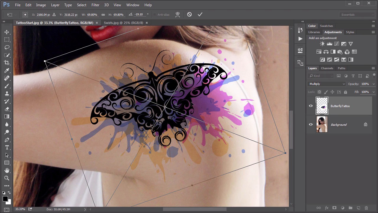 Hello everybody, welcome back to Mastering Blending Modes in Adobe Photoshop. This is lesson 3.3. Where we take a look at a practical application of the multiplied blending mode. In the course files for this lesson there are three specific files. That I want you to take a look at. First, is the TattooStart.jpeg of this young woman with the shoulder that looks like a blank canvas for a tattoo artist. There's a swirls.jpeg and a butterfly tattoo.psd file. And this is the file that we're going to start with here. If you look at the layers for this file, you see there's a butterfly shape and there's a splatter shape. The idea is to have these colorful splatters sitting behind that butterfly and that will be the basis for the tattoo. First of all, let's move the spider beneath the butterfly shape and start positioning it. And you might notice that certain portions of this butterfly shape are whited out. Because the way these swirls ended up being constructed, it had to have some white areas in there. But that's easy enough to get rid of by simply changing the blending mode to multiply. And that white completely disappears. And then the general idea is to begin moving the splatter around. To position it in ways that looks interesting. And looks like an almost organic ink splatter but still very colorful and attractive. We'll start with one about right here, so and maybe pull down the opacity a little bit to lighten that, just a touch. And then let's make a copy of it. Here's an easy way to make a copy of layers like this. With the move tool selected, hold down the alter the option key, and just drag on that layer. And let's add another version of it, say over here. We'll double click on it and we'll change the color of this one. Make this one blue. Then let's add another one, a little bit behind that. And we'll use our free transform. I edit, for transform to rotate that around. And maybe scale it up a little bit and change the color this one to an oranges color. And then let's move this orange one down below the other two, because what I wanna do is have these colors interact better. And the way I wanna do that is changing the blending mode to multiply for these top layers. And I like the way that creates a much more attractive and organic way of mixing those colors together than it did just with the opacity. In fact we can put that opacity back up and you can still see those other colors behind it. So we'll set multiply to the pink one too, and then continue using this technique to create more copies of these splatter layers, move them around, change their colors and just create a very colorful interaction of these paint splashes, so here's the arrangement of paint splatters that I ended up with behind my butterfly image. So let's go ahead and save and close this file, so we can use it as a smart object in the tattoo start. And we'll do that by going to File > Place embedded and select that butterfly tattoo that we just created. And you'll see it comes in as a smart object. And we can just loosely place it about where we want to be. Notice that, while we're still placing it we can change the blending mode before we even have to commit the transform. So we'll go ahead and change it to multiply, so we can see where it's going. So position it onto her shoulder. Now we wanted to follow around that curve of her shoulder. The best way to do that is with the warp transformation. So I haven't even applied the transformation of the original placement. I can right click and say warp. Now if you've already applied yours that's fine. You can still get to it through Edit > Transform > Warp. But then I can start dragging these cage handles to form the tattoo to cover over the shape of her shoulder, and that looks good about there. Now I do a very similar thing with that swirls.jpg, in fact, I don't need it open because I'm also going to include it as a smart object. Let's go to File > Place embedded again. Use the swirls. It comes in as a smart object. And this time I actually want to flip this horizontally. So I'm just going to drag that right hand side completely over and then scale and position this into place. Rotate a little bit, I'm gonna use the exact same technique that I used on the butterfly. As in change the blending mode to multiply and then warp it. To make it fit into the curve of her shoulder blade. I like the way that that fits about there. Now the colors behind the butterfly are getting a little bit lost. They're a little muted for what I'm trying to do here. So let's add a vibrance adjustment layer and clip it to the butterfly tattoo layer. We do that by holding down the Alt or the Option key and mousing right in between those layers until we see that cursor change. Then we click and it clips it right to it. This means this vibrance adjustment layer will only affect the butterfly tattoo layer. And we'll increase the vibrance of that so we get a lot of color. Reintroduced into that tattoo. At this point, the tattoo is looking very colorful and very dark. In fact it looks artificially so. We're not seeing any of the skin texture through it nor is the lighting, reflecting with the lighting should be in the scene. Here's a great way to correct that. First, let's group all of these together. The butterfly tattoo, the vibrance, and the swirls layer, and select all of them by holding down the shift key and going to layer, group layers. This is the tattoo group. For the moment I'm going to hide that. So we're looking at just the base photograph again. Now what I wanna do, is load the luminous values of this photograph. So I'm going over to the channel's panel, holding down the control or the command key, and clicking right on that RGB composite channel. What this does, is it creates a selection based on the luminous values of those pixels. Which means I can go back here, to the layers panel, reveal a tattoo again, and this time I wanna create an inverted mask from that selection. So I'm holding 