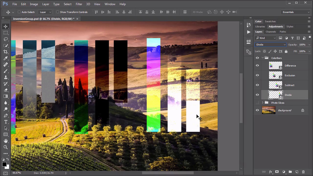 Hello everybody, welcome back to mastering blending modes in Adobe Photoshop. This is lesson 6.1, where we take a look at the Inversion group of blending modes. The Inversion group is that next set of blending modes that goes from different to divide. There's only four of them and they all do something rather similar. We'll start with the Difference mode and that's using these color bars over here on the far left. If we set this to Difference, we can see that the black completely disappeared. The gray tones are a little bit darker, the white is generating a negative effect with those background pixels. Officially, what this blending mode does is a selective inversion. Whereas, the black color in the blending mode gets completely removed and doesn't do any inversion at all. The white color always does a complete exact opposite inversion, creates a negative effect. And the rest of the colors create an inversion based on the brightness levels on a channel by channel basis. One of the most notable properties and arguably the most useful property of the difference blending mode is that similar colors are rendered as black and we'll see why that's important in just a few minutes. But first, let's move on to the second one, which is the Exclusion blending mode. So if I take this next set of color bars and set this to exclusion. Now the exclusion is also a selective inversion mode, where the black never gets inverted. The white inverts absolutely, as in, it always creates a complete negative of the background pixels, but the gray is completely untouched. In the Exclusion mode, the gray is excluded. Also, similar pixels cancel each other out like they did in the Difference mode, but this time instead of being rendered as black, they're rendered as gray. Moving on, let's take a look at the Subtract mode with the next set of color bars. So we'll set this one to subtract. Now at first glance Subtract is actually pretty similar to the Difference color mode with a couple of very noticeable differences. First is that the white color on the blending mode here is rendered completely black, because it's being subtracted from the colors that are behind it. The black color that was on the color bar here is rendered completely invisible. But only full black if you take a look at the gradient here. As it goes down, it's only the very bottom of this white to black gradient that's being rendered invisible. And in the color bar, we're seeing something a little bit different there. On the color gradient here we're getting an inverted color that's overlaid over the background color. Look at the difference in between the Subtract blending modes color bar and the Difference blending modes color bar. While the Difference mode is creating an inversion of those background colors, the Subtract mode is actually inverting the colors in the blending mode and then overlaying them over the background. Now let's move on to the Divide. We'll change this last group to Divide. And this one does almost a direct opposite of what we see done on the Subtract mode. In the Divide mode, it is the white pixels that are completely removed. The black pixels are now rendered white, and the grays are creating a much lighter color, whereas in the Subtract mode, they were creating a darker color. Also the color gradient is creating that inverted color of the blending colors. But this time it's almost screened over the background as opposed to the overlay or multiply that we saw with the Subtract. So using these color bars over this background photo, we get a feel of what these blending modes do. But it's kind of difficult to envision why we would use these. They seem rather, kind of obscure as to what their effect is. And for that reason, I wanna show you something that's a little bit more practical and helps you to understand these. What I've got in this group is the photo slices. So if I turn off that background, you can see I've got these four slices of that background area, and if I move these around, you can see what they are. I just created rectangles around these individual spaces and created slices from the background. So if I change these now to those different blending modes you'll see what happens. First of all, let's use this Difference blending mode. Notice how that all turned black. That's because the pixels are identical to the pixels behind it. In the Difference blending mode, when pixels are identical they're rendered as black. Watch what happens when I take this layer and just move it slightly. We start to see some more strange little colors coming into play there. And that's one way of using this blending mode to know exactly when layers are lined up on top of each other. You can keep moving it around until it's rendered black, and then you know it's exactly in place. Next is the Exclusion mode. So we take that next box, we change this to Exclusion. And notice the difference here. As we move this one around, we get a wholly different effect as we did with the Difference one. In this one, Photoshop is attempting to take pixels that are very similar in color tone and rendering them as gray. And we can see that that doesn't always create the results that we would expect. Because we would expect this entire square to be gray. But that's not how it looks. That has to do with the way the math works behind this mode and its selective inversion, where the black never gets inverted. Let's now move on to the Subtract blending mode. We'll set this one to Subtract. And like the Difference mode, this one produces exact black when the pixels are aligned. And by moving them, we get almost an outline type of effect. And then with the Divide mode, we'll change this one once more to its namesake. We get a similar thing, except this one creates white when similar colors are overlaid. And if we move this one around, it's a very similar effect to both the Subtract and the Difference, but it's completely inverted. Now, admittedly, these are not 