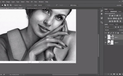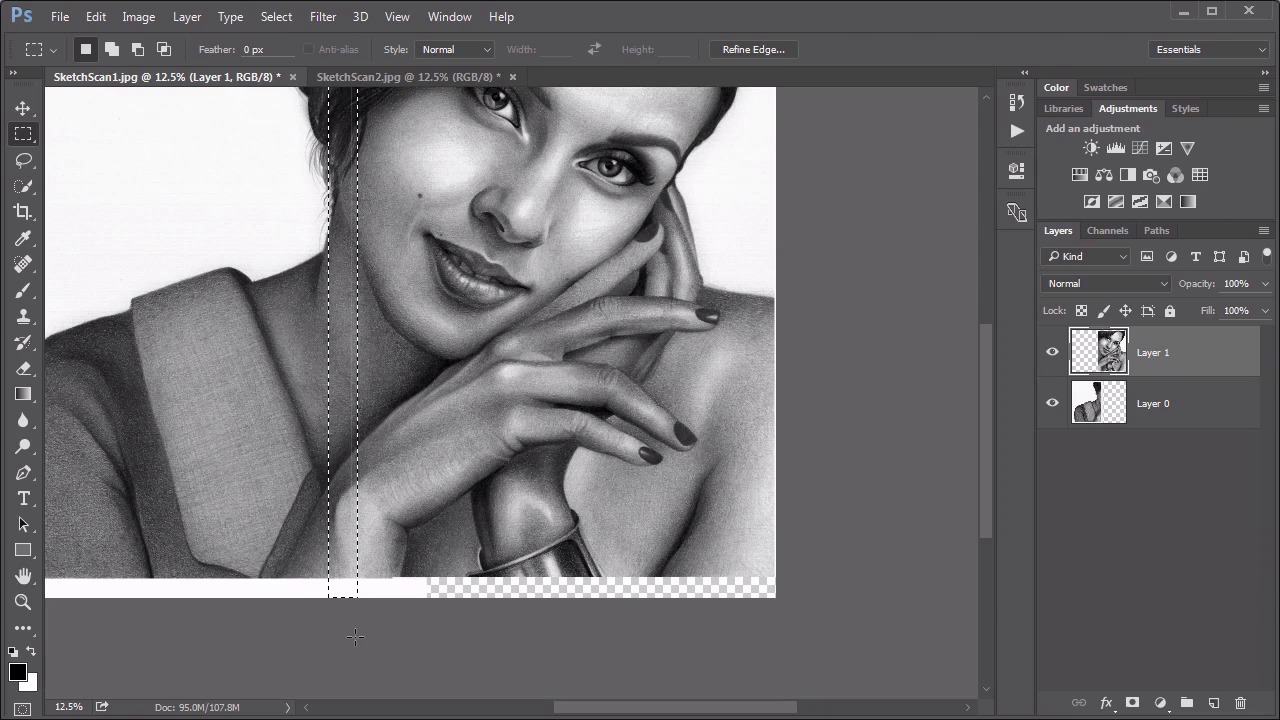 Hello everybody, welcome back to Mastering Blending Modes in Adobe Photoshop. This is lesson 6.2, where we look at some practical uses for those inversion modes. I want to start off with one of my favourite blending mode tricks, it's one of the oldest ones in the program, and it still works well today. In the course files for this lesson, there's two JPEGs, a sketch scan one and a sketch scan two. Let's presume that this is a pencil drawing that has been scanned in, but because the drawing was so large, it didn't fit under the scanner all at once. It had to be scanned in two separate scans and your task is to assemble those two scans together into one seamless file. While the difference blending mode is ideal for this, if you remember when we went through the descriptions, the difference blending mode renders pixels black when they're identical. So the general idea here is the first grab this first portion of the scan, we'll just use a rectangular marquee tool to outline that and we'll go to edit > copy, back over to the other file, and then go to edit > paste, and it comes in as a new layer. Use the move tool and we try to go over and line these up. We can try to just go ahead and align them visually, just to try to get it to match up right by just moving things around, and we might get a pretty decent alignment there, but by using that blend mode, we can get a perfect one. If we set this top blending mode to Difference and we zoom in enough so that we can see the pixels that are being rendered differently, then we can start moving this around until we know it matches perfectly and you'll know when you hit it because it pops in as perfectly black. And look at that, that solid black stripe all the way down means that this layer is perfectly positioned. So we'll change it back to normal. Use the crop tool to expand this canvas to include the entire drawing. Now I do have this little line of pixels here, that's just because the selection around this one was a little bit wide and just grabbed that one little thin line of white pixels. That's easy enough to take care of. We'll just use the selection tool again, and I know there's some overlap, so I don't have to worry about deleting too much. I just hit the delete key, and it removes those pixels and now we have a perfectly aligned drawing from two different scans. Let's go ahead and fill in that background with white, just so it's consistent all the way around and that's one of the best uses of that difference blending mode. The other blending modes in the set can actually produce some pretty interesting digital effects. Let's start with this little girl.jpeg, which is also in the course files for this lesson. I'm going to make a copy of this background layer, rename this to duplicate, and then just turn this into a smart object, because it'll be a little bit easier to see what we're doing with it. And if we change the blending mode of this duplicate to divide, it creates a really strange blown out effect here. But now watch what happens when we add a Gaussian blur to this. Go into filter > blur > Gaussian blur. If we keep it at a low enough setting, it produces an almost digital sketch like effect that is pretty interesting. And if we get up high enough, it creates a pretty attractive high key effect, and it's easily controlled just by the amount of blurring that we add to this. So really, that's two totally different effects that you can easily get just with this one divide blending mode. Now if we changed it to subtract, we can get a very similar type of effect, but it's inverted. So the idea then is to add an invert adjustment layer above that, which creates yet a totally different sketchy type of effect. And again, just by adjusting the amount of blurring, you can increase or decrease the amount of that sketch effect. Although with this approach going too high with the Gaussian blur creates a very weird looking result. So you wanna keep it fairly low, it's just an easy way to get the beginnings of what looks like it could be a digital sketch. But overall, my preference is for the divide technique, and I really enjoy the way this gives a very interesting sketch like effect, at least a good starting point for you to then build on if you wanna create more interesting and creative effects with this. Now it's time to move on to chapter number seven, which is the last set of the blending modes, and that's the component set.