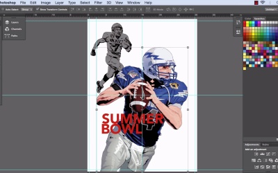 Hi there, this is Simeon for Touch Plus and in this lesson we're going to look at adding text to our sports poster here. Okay, so basically the first thing we're going to do is just assess what we have done. We've rendered out our two tone quarterback here. If we open up the folder we can see that we've got the line work all in here in one folder. We can even get rid of the folder, but we'll leave it for now. We've got the base sil. Then we've got our main quarterback in the forefront and the detailed render that we created in Photoshop. Okay so, what we wanna do is just entitle the quarterback, Quarterback. In a moment, it's layer one. We just keep everything organized and we just entitle that Quarterback. Okay, awesome. Now we want to introduce some text. So the actual Theme that we're going for in this course is for the design is actually a summer bowl tournament. So the main prominent words for this poster will be summer bowl, okay. So what we're going to do is just type that out. And in nice big letters and we'll arrange it in a way which will carry off the design and give us the basis for us to work around. So, initially what we shall do is just [INAUDIBLE] the title. Now we've got a type face if you have it on your computer, which you should do, is Avenir, and that's set to black, so it's Avenir black. What we are going to do is click on, and I've actually got a size of around 109. We may need to increase that slightly. We will start with a size around 110. And what we are going to do is put it to the forefront color as a bright red at this point. We may change it later on. I'm just gonna type in summer. Okay, excellent. And we're just gonna click away then click back onto the type tool. And now we're going to type in bowl and that's B-O-W-L. Okay, awesome. Now we've got those two on separate layers. Now, just going to bring summer inside here a little bit, how are we going to line it up? We're actually going to line the text up with the quarterback here. Click on the quarterback, and again minimizing the layers pallet so we can get to our rulers, we're actually click onto a selection tool, go into the margins. And then we're going to go into our margins, we're going to actually bring over a rule that comes to the edge of the quarterback bounding box and then again on the right hand side as well. So we're gonna use these as guides for our text. So, initially what we'll do is we'll just increase the size of summer. Click back on the text tool to increase the size of summer to 135, okay. And then we'll click on Bowl, and we'll do the same thing, increase it to 135. Okay, that's brilliant. And now we'll just line these up nicely, so summer. Want summer just below the football itself and lining up. We'll just zoom in. Let's have a zoom in so we can see, I think, what's happening a little bit better. And we'll move bowl out of the way as such for the second. So summer okay, we have around there, and bowl, we'll snap to the edge of there, and literally we're going to put them right together then. One, two, three, four, five, six, seven, eight, nine, ten tabs down. And we'll have summer and bowl as is. Okay, that's awesome. Basically, now we've got something to line up our text with. If you press Ctrl+; just to get rid of the Guides for a moment, cuz sometimes they can be a bit distracting. And we'll just have a look at what we've done there. So we've summer bowl, and that is looking pretty decent. So now what we'll do is we'll finish it off. So we've got summer bowl is going to be tournament 2015. So we'll keep the typeface the same, but we'll have tournament 2015 considerably smaller, maybe 48. So we create a new layer, and literally just type in tournament and then 2015. Okay. Right. Okay, that's excellent. Right. So bring back our ruler and just line it up as per se at this moment in time. Okay, that's brilliant. Okay, so that is how you add text to the poster design. In the next lesson we're gonna look at adding some splatters to the composition and also, the text. I look forward to seeing you in the next lesson.