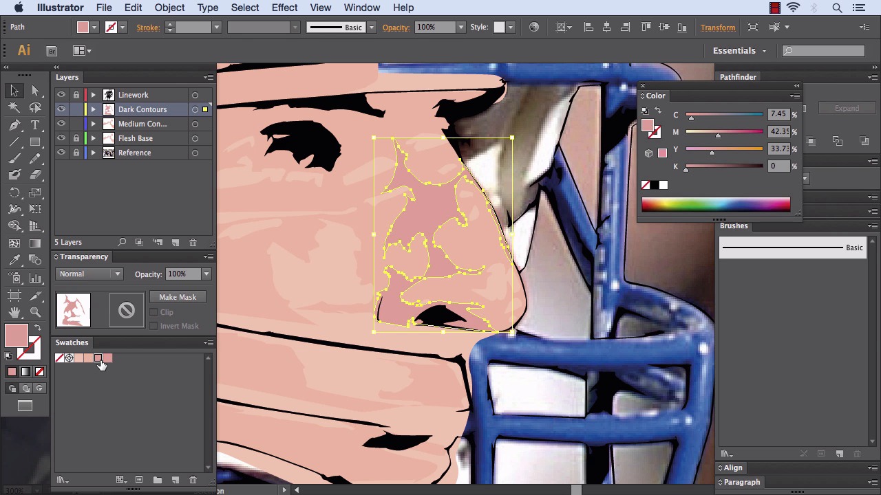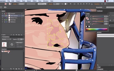 Hi there. This is Simeon for Tuts+. And in this lesson, what we're gonna look at is creating the dark skin contours for our vector board trait here. So if we haven't recap on what we've done in between lessons is, we've finished off the neck, left and right arm of our quarterback here as we zoom in. Okay, awesome. And now what we are going to look at is applying the dark skin contours. So, we've got our medium skin contours applied and then we are going to go to the dark. So if we just look at the reference image with just the linework above it, we can see that we drew the screen base. We drew the medium contours. And now we want to create another layer and entitle that dark contours. Okay. So let's click the Create New icon on our Layers palette. Turn off the visibility of the Medium Contours layer and the flesh-based layer. And create a new layer, as we say, and entitle this Dark Contours. Okay, so we're gonna work in the same fashion. We're gonna get a color palette and just remind us of where we position the medium contours on the face. Then we're gonna apply the same procedure for the rest of the player's flesh, arms left and right and neck. Okay, so, let's have a look. Let's zoom in to the face. We can see that the nose is one of the points that has got the best variance. So if we click on around here, we get a very pinky color. Don't look too tremendously pink. What we can do is actually create a blending effect but let's have a look. These dark skin contours. Maybe if we just click around here. Okay. As we can see, there's a lot of variating. We'll look at our Colors palette here, there's a lot of variating colors. The flesh variates, especially when one is playing sports as our player here is. If we look at this color we have here which is C 7.45, M 42.35 and Y, we just ran it up to 34. We're actually gonna take a measurement of that. And what we're going to do is just, again, we're gonna double-click on the swatch and we're gonna entitle it Dark Contour. Okay, excellent. Right, we've got that dark contour there. Just gonna see about applying it. So what we we'll do, is we'll click on Opacity to 0, as we have been doing. We will zoom in a little bit tighter, we want to mark in the darkest areas now. So like we say, Opacity to 0. Rarely such grooves as around here. You can see it on the nose, if you can see the just, it's the darkest points we want. If we come inside here, just get nice interesting shapes as we go, and just round the edge of the nose, if you see that outside edge of the nose is a lot darker, right. Okay. And then again just round here. Just touch in on this little darker area here going along and through, around and up anywhere where we see the darker areas is coming in. It might be very thin at points but that's what we'll do. And again, just down here and we'll go back up from that point. Okay. We'll come back round and come through to complete our shape. Now, we'll put Opacity up to 100 and we'll turn on the visibility. Now, what we can see for this is a good pink and it was accurate to what we had. But there's a few things, just to keep it uniform until we've done what we're gonna do. First and foremost, we are gonna click onto that, the pink, get our Colors palette out, and we're just gonna take out a little bit of the cyan. And we're gonna increase the magenta values slightly. And also the yellow, just the one. Right, so actually, just going to put that back into our Swatches palette. And what we were gonna do with the original Dark Contours, we're just gonna throw that away in the bin. Just be sure that we got the right one selected. So I'll double-click on this and now we're gonna call this one Dark Contours. It sometimes happens. And the other thing is it's standing out a little bit too much. So what we're going to do, just create a nice blend so it blends into the medium contours a bit better. And the way we do that is, we bring up our Gradients palette. So what we'll do, we'll open up our Gradient palette. We'll just pull that out. And we're going to set our Gradient Type to Radial. The next thing we'll do is we'll get the dark contours, we'll put that in the left side. We'll get the medium contours, and we'll put that to the right side. Okay. Now, we're just gonna tap onto that new gradient we created. There we go. So, we've got our gradient, which is applied to this new shape we've drawn. Now, we want the outside to be a lot darker and the inside maybe a tad lighter. But, start with the outside. So we click on to the far most lightest pink and we're going to our 50% location, just click your way up from the right side and drag out. Now you see that makes it considerably darker. Click back onto it, and we made the inside a little bit lighter around location 17 and just pull that out. And again, on the outside, a few more times until we've got a nice blend there. Now we see, that is the blend that we're gonna be looking for to apply throughout the Dark Contours layer. Maybe let us make it a tad lighter, still. So, if we go into location, about 21 and just pull that out. Okay, awesome. Okay, that is how we would apply the dark contours to the rest of the illustration. Now, just looking at the actual nose itself, if we click away, we can see that there's even a dark area here. Okay, so what we're gonna do is, we're just going to apply that kinda reddy area and create a new layer and call it Darkest Contours. Okay, awesome. Now what we're going to do, just zoom in and again, with the eye dropper, we can see we want a very kind of brightish deep pink. So sometimes it's even better if you actually get the eye dropper and just place it beside the kind of area. This is the kind of color we're looking for. Maybe a little bit deeper inside. Okay, so we'll go for that color, which is C35, M79, Y67 and K29. We just click OK. Okay so, we'll call that Darkest Contour Red, that's awesome. Now what we'll do with the Darkest Contour Red, again, we're gonna place it on
