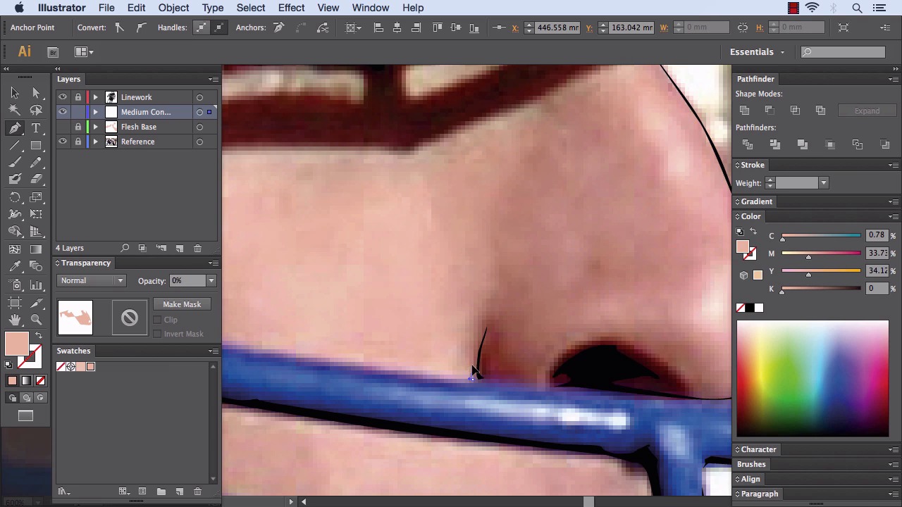 Hi, there. In this lesson, we're going to draw the medium contours for our vector portrait here. If we look at what we did in between lessons, we just completed underneath the neck and the left arm of our quarterback, and in completing the flesh work layer. Now what we're going to do is move on to creating the medium contours. Okay. So, if we start by lock in our flesh based layer and then creating a new layer by clicking the new layer icon and then entitling it, Medium Contours. Okay. Awesome. What we're going to do now is turn off the visibility of the Flesh Base layer, and we're going to turn on the visibility of the reference layer and just zoom in again to the face. Now what we want to do is have a look for a medium contour in regards to what we had as a flat, flash-based color, which is a pinky yellow. Now we're gonna go for a color that will go on top of that and give us some good contours. And we'll show how to apply those. So, we get the eye dropper, and we just click around here. We can see we've got a good color here for our medium contour. So, it is C 0.78, M 33.73, and Y 34.12, and the k value was 0. Again, we are going to get that color filled and we are going to drag it to the swatch pallet. Okay, and entitle it so we'll know what it is. Because we usually hang out with a flesh base. It gives us a flesh based color so we are going to double click on this and we are going to entitle it, Medium Contour. Medium contours. Okay, awesome. Just press, Enter. Right. Now, we've got medium contours. We're just gonna have a little run through where we're gonna play. It is quite tricky to be [INAUDIBLE] on this layer. We're gonna ignore the fact that the helmet is here, and we're just gonna run through. But we're gonna look at these medium kinda areas here and just apply it like so around these areas. So let's start just here, around the corner of the eye, and run it through. We'll set our opacity to zero, and we're just gonna curve around all this area here, round about through. We're going to have a shadow going on top of that. So, we're just going to go on the outer rims of this color within here in this corner. And now, looking at the top of the cheekbone, gonna run that around. We can see it's very much lighter here. So we'll just run it thinly just here underneath, surrounding the cheekbone area, and then we'll draw it quite extensively from the top of the nose here and inside, just weave around those light patches. And if we zoom in to the nose, so we're just gonna see better what is that medium contour that we need to draw. Awesome. Let's go along right up until the line, to the edge of the nose. And if we have a look, we can see that a medium contour comes in again. So round this part of the nose let's create some interesting sort of curves as best as we can. Okay. And some nice detailing as best as we can, and now just going along the edge of the nose. We'll just come inside here, because we see, we've got that slight light area around the edge of the nose. And let's just have a look. So, we want this area here, just that little bit right there. I'm gonna come back round. And we're just being very disciplined, just to spot the, we go back what the medium contour. Just bear in mind that there is going to be [INAUDIBLE] layers going above it. We are just going to see the medium contour. We see there's light here, so we draw around there, around this part here, around the cheek. We see this thin line. We'll just all draw along that line as best as we can. And then we'll come down here, and we're actually going to draw a bit. So over, around, above the upper lip, and then we've got some lighter areas of red again going around the outside, so if we curve that in. Excellent. And then, again, we draw these shapes up in here. Let's zoom in so we can see this corner properly. Let's go on in down and around. So we're actually gonna come back in here for a curve along there. We won't worry too much about the lips because we're gonna be drawing on top of them, just get the base parts. So we come around this part below, adjacent to the lip. And we just draw along this line again cuz we got the lighter areas just above it, so we don't want to draw into that part. And then, the corner as well, just where a bit of light shine is coming through. Okay, awesome. [SOUND] So now we just go up along the edge. I'm gonna say, let's go up and around and up here. And around down here. Okay, awesome. And go along this area and come back down. Just finish off this partition here, just zoom in. Let's go along here. Let's come inside because we've got some areas there where we're going to add darker contours. All right. So, just going to go around and we're actually just going to draw these areas in here. I think I wanna [INAUDIBLE]. So, we weave back on ourselves so we don't overlap. Convert our shape. Come back along here. I've gone around. Just up this part here and just draw just a little bit inside here because these are a bit light in those areas and complete our shape. And then, we'll put opacity to 100. Okay. So now, if we click on our base layer, we can see that we're getting some contrast in there, some detailing. That is the same. The principle that we will apply for the arms also and underneath the neck. So, that is how you apply the medium contours to the board trait. What we will do is continue applying medium contours to the neck and the arms also. I look forward to seeing you in the next lesson.