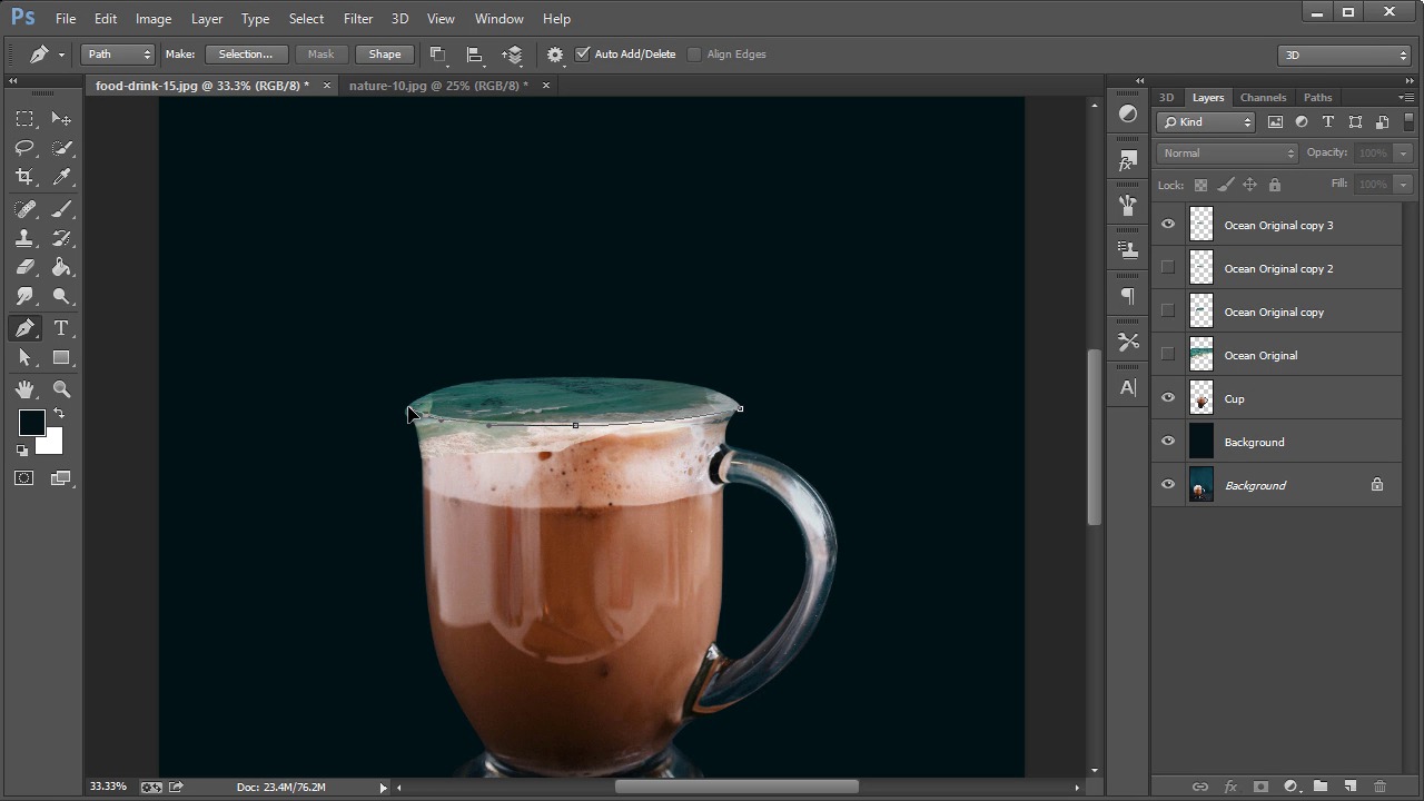 In this lesson, you’ll cut out an ocean from an ocean photograph and composite it into the cup you cut out previously.