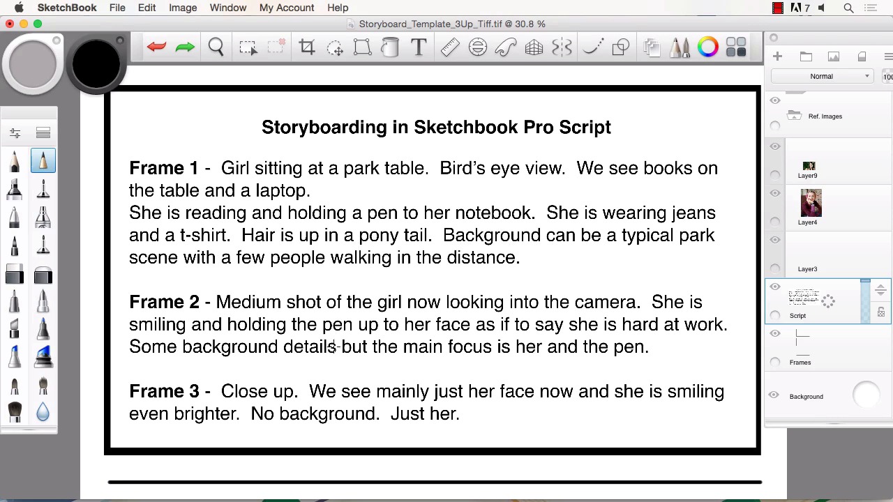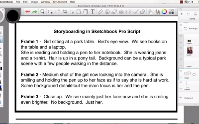 Hello everyone, welcome back to Story Boarding and Sketchbook Pro. My name is Robert Marzulo. We'll now be covering chapter 3.1, briefing over the script. So now first things first. Before starting any type of Storyboard job, you're going to have to go over a script. Now, for the sake of this course, we're going to keep the script relatively basic. I've definitely dealt with scripts that were a lot more complex than this, and some that, on occasion, were even more basic than this. But this is a basic understanding of what a particular script might look like. So, you've got your frame, obviously. Your description, the shot, whether it be a bird's eye view, a medium shot, a close up. You're gonna have lots of variety of different types of shots. Extreme close up, angles, all these different things, work placement of the cameras. Then you're going to have details, like in this particular shot, we see books on the table and a laptop, little descriptions like that. This is your opportunity, when you go over a script like this with your editor or your agent or director, whoever you're dealing with. Oftentimes when you work with a script like this, you'll actually start by getting on some sort of conference call and maybe dealing with as many as four or five people at once. Sometimes you're lucky and it's just one person which is always nice. So, when that occurs, that is your opportunity to ask any questions and really start to paint a mental picture of what they mean by their wording. Sometimes, the wording will be more vague. Other times, there's excessive amounts of detail, but you need to always make sure that you understand exactly what they're trying to depict to you. And that's the trick of storyboarding, that's where the talent comes in and the foresight to be able to see into the problems that might occur when trying to illustrate this type of stuff. So we'll start with this, frame 1, girl is sitting at a park table. Bird's eye view, so the camera is up in the area looking down at the hero, which is commonly referred to the hero character in the storyboards. We see books on the table and a laptop, okay, pretty easy to understand there. She is reading and holding a pen to her notebook. Obviously pretty easy to understand there. And just to give you an example, even here, you could ask something like, as simple as this may sound, is she left handed or right handed? Is she hunched over her notebook, or just casually leaned back? Those are just examples. Obviously, that's not really that big of a deal in this type of story line. But, that's the way I want you to look at the script, and foresee any issues. And try to work the images out in your mind. She's wearing jeans and a t-shirt. Obviously pretty easy there. Hair's up in a pony tail. If these are going to color, you start asking things like, what color's her hair? What is the setting in the background? Obviously it's a park, but what time of day is it? Because the time of day will affect the coloring of those boards. If they're just line art, then all that goes out the window, obviously. Background can be a typical park scene, with a few people walking in the distance. Now, there you could say, how large is this scene? How small is she in respect to the entire scene? That will tell you how much of the park you need to draw in the background, and how many people you might want to fill up that space. Or is it a busy park or is it a very secluded type park? So questions like that are all going to factor into that type of story telling. Now Frame 2, medium shot of the girl now looking into the camera. She's smiling and holding the pen up to her face as if to say she is hard at work. Some background details, but the main focus is on her and the pen. Okay, so a shot like this, she's now really tight into the shot, a medium close-up. Now, keep in mind, a medium close-up, or medium shot, can be depicted a few ways. I've seen people say a medium shot, and it was waist-up. I've seen people say medium shot, and it was shoulders-up. So, this is a little bit loose to interpretation. And that's where you also need to ask questions and define that. And that's also where thumbnailing and rough sketches save the day in this type of work. Instead of assuming that you understand exactly what the director or coordinator means, it's better to thumbnail and do the roughs, and send them back and forth, and totally understand all of these, you know? Even the angle of the face. This is obviously forward into the camera. She's smiling and holding the pen up to her face, as if to say she is hard at work. You can ask small questions like, is the pen angled to the face? But again, something to keep in mind. If they don't specify, then there's a chance that they want you to just creatively come up with that look, and design that. So always keep that in mind too. Frame 3, close up. We see mainly just her face now and she is smiling even brighter. No background. Just her. So now, the background's entirely omitted. The focus is just on the hero character. She's smiling even more which means, brighter, more teeth, more accentuated on the smile. And close up, again, could be loose to interpretation. It could be close up, or extreme close up, and that would rectify in the thumbnails. And sometimes it's better to start with a wider shot, because you can always tighten into the shot, by just increasing the size of your artwork. So, if you're up in the air about what it might mean, always start a bit wider. It's easier to tighten in. Versus the opposite, where you would actually have to draw more artwork around your initial sketch. So okay. So now we have a pretty good understanding of what they're expecting for each frame. Now keep in mind, other good questions to always have handy when doing this type of work is, what type of character do we have? What ethniticity? What body type, size, weight, things like that? It's always good to have all those questions in mind. So th
