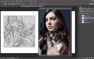 Hello and welcome back to surreal digital paintings, my name is Melody Nieves and this is lesson 3.3. How do you think we should light this painting? In this lesson, we'll cover potential lighting scenarios by creating two small thumbnails to practice. After following professional artists for many, many years, I finally picked up on a technique that has saved me so much frustration. You can test out what your painting will look like just by creating many thumbnails. Try to look at it this way. A thumbnail painting is like having a cheat sheet for a big test. If you've ever sat in front of a computer not knowing what step to take next, it's probably because you've hit a dead end. Test out the lighting scheme with several thumb nails until you land on the option you like best. To do this, we'll create two thumb nails using the original sketch, then carve out possible lighting scenarios in gray scale. First, merge all the layers of your sketch together. Then hold Ctrl+J to create a duplicate of the sketch. We'll use this duplicate for our thumbnails. Create a new layer and hold Ctrl+A to make a selection around the sketch. With the rectangular marquee tool selected, right-click to use this selection to create a border. Set the width at 10 pixels, and hit OK. Select both layers and merge them together. Now it's time to create a new document for the thumbnails. Hit print screen on your keyboard to take a screenshot of your display area. When you go to create a new document, this automatically attaches the dimensions from the clipboard which in this case is 1366 by 768 pixels. Once the document is open, instead of pasting your screenshot, go back to the window with the sketch and copy and paste the sketch onto the new document. Naturally, the sketch will be much bigger than your document so adjust the size by free transforming the image. Once the thumbnail is in place, create a duplicate and position the copy into place. I'll only need two thumbnails to test out the lighting scenario. I have a feeling that if I follow my main reference image pretty closely, that all I have to do is figure out the lighting for the other elements, like the water and fish. Go to the color picker and select the gray color. Use the rectangular tool to create a selection around each thumbnail, holding the Shift key to create both selections at once. The use the pain bucket tool to fill in the selections with a gray color. Now let's use my favorite brush from earlier to paint these lighting scenarios. As I mentioned before, I'll be using the main reference of The Woman with a Pearl Necklace for the general lighting setup. I figure that it's probably easier to rely on a reference I have available than to make one up from scratch. So let's keep the reference close by by undocking the window and positioning it over the second thumbnail. Create a new layer and set it to multiply. Then, with your brush tool selected, hover over the grey area and hold the Alt key. This will switch the brush tool over to the eye dropper tool to pick up the color. Because the layer is set to the multiplied blend mode, the resulting color is automatically darker. You'll be able to carbon the shadows of the painting fast and easily because you never have to go back to the color picker. Start with the shaded areas that are easiest to see from the reference. I don't want to deviate too far from original, but this practice will automatically help me become more familiar with the lighting set up. To make the shadows appear even darker, all you have to do is duplicate the layer. Use the light gray base for the mid-tones of this setup. So all we really need to paint is the shadows, and then the highlights. As I move on to the rest of the details, that's when I start experimenting with shadow. I try to pay attention to the original light source, which is coming from the top left side. Keeping this in mind, I paint in very basic shadows for the water and fish. All I need is a very general understanding of the lighting set up so it's not necessary to go into too much detail. Once the shadows are in, then move on to highlights Add a new layer and use it to paint in white highlights coming from the left side. Make the light bounce all over the painting, and you'll see how each shape becomes even more voluminous. Here is the final result for the first thumbnail. It might not seem like much, but just by flipping through the layers, I can already tell that this step has shown me the incredible potential of this painting. So let's move on to the second thumbnail, for the second thumbnail I'm going to cheat the shading just a little. As you know, I wanna keep a general shading from this reference, so I'm actually going to copy and paste the first layer of shadow from the previous thumbnail, and use it for the second. Your ultimate goal should always be to create the best art you can possibly make. So the purpose of the second thumbnail is to see what changes I need to make, in order to make the lighting scheme even better. Since the lighting originally comes from the upper left side of the first thumbnail, I'm going to change this by making it come from the lower left side. Of course, you don't wanna switch things too dramatically, because the light always has to come from the left in order for the shadows to make sense. As you can see, the first thing I needed to do was fill the background completely with darker shadows, so that I could focus on the highlights towards the bottom. And once I have a couple of the highlights in, I can start to gauge where the rest of the shadows will appear. I really thought that I would like the initial thumbnail more, but the second completely won me over. Because there's lighting at the bottom, there's much more emphasis on the foreground elements like the fish and water, which is what I originally wanted when I developed the concept for this piece. And even though the reference has a slightly different setup, it's important