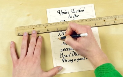 If you want to make your mock invitation more ornate, you can add some embellishments. In this lesson, we’ll be pencilling in the embellishments found on your Mock Invite Guide, including horizontal lines and curving, floral designs. For even more ideas, do a simple internet search for ‘calligraphic embellishments’.