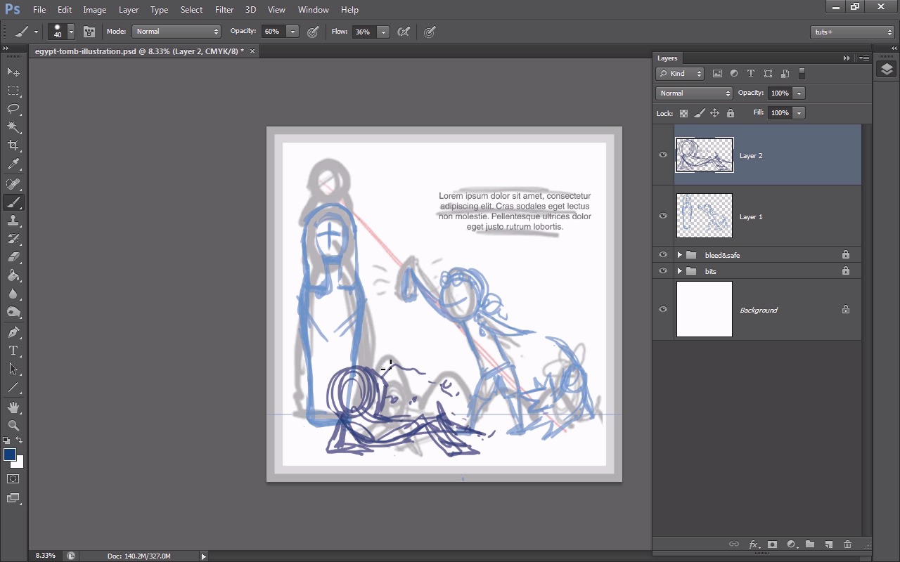 In this lesson we will be creating the rough shapes and poses as a basis for our illustration.