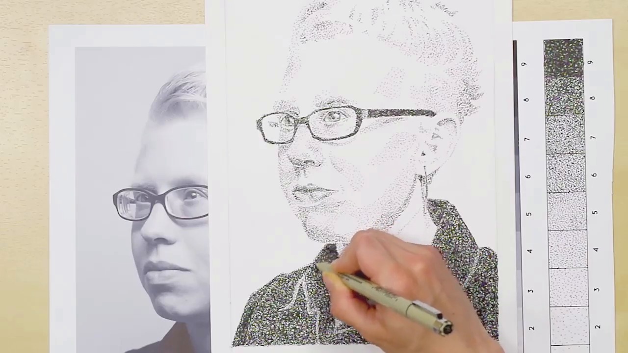 So far, we've been inking in a base layer for all of the values on our drawing. But now it's time to really push those and work on blending. So the first thing we're gonna do with blending is to lay down a new layer of dots to help transition from one value area to another seamlessly. Then what we're gonna do is work on really pushing our value scale, so that our drawing has the full zero to nine in it, all the way from the whitest whites to the darkest darks. So as always for these next few lessons, you're gonna wanna have your drawing. You're gonna wanna have the black and white photograph. And you're going to want to have your gradation scale for reference. Once you have all of these, you're ready to start blending. All right, we're finally on to the blending part. So you probably notice that my drawing looks a little different. It's because I went in and erased all of my pencil lines. So keeping pencil lines in past this stage is a little bit of a bother, because they create a visual barrier along the contour lines, and they also distort your perception of just how dark you have gone, because they mix in with the ink, and make you think that an area is much darker than it actually is. So erasing at this stage means you get a much better idea of what the piece will look like when it's finished. So I would recommend going in now with a white eraser, and carefully erasing all of the pencil lines, go slowly, take your time. You can stop the video now. You might notice it pulls up some of ink in terms of its vibrancy, don't worry, because we are gonna be working quite a bit in these next few lessons. Adding more ink, pushing our values, blending things in, so that vibrancy will come back. So the best way to now start the blending is to make sure that we can have the full zero to nine scale in our drawing. So the easiest place to start is where we have the most of the value nine. In this case, that's gonna be my shirt. So I'm going to start in on the shirt, pushing with more squiggle lines and more dots the areas that need to get boosted to a nine. What this does is, it helps us later when we go into the face, because it will really show us where the mid darks need to be. You can do a lot of drawings where you don't have these dark darks. And you think that you're done, and then as soon as you put in one of the value nine areas, it skews the whole thing. So I always like to start by putting in the darkest darks, and it's give me a better marker of just where my value range needs to go. So as you saw from the video when we filled in the shirt, this is gonna take a little bit of time. Though not nearly as much as before. So we are going to speed things up a little bit, but you'll just work along at your own pace. Turning some of these six areas, with dots moving them up to a seven blending eight to nine, just really using the photo as a guide. Now, I'm just double checking where everything falls in the value scale. Just work along at your own pace and start to really push those values. Adding that extra layer of squiggles really start to push the values here. Since it's the black shirt, it's gonna be really dark in here. Using the squiggles instead of just the dots is gonna save us a lot of time. And after doing all the repetitive motion of the dotting, making the lines feels a lot nicer in your hand. So working to try and make that collar pop out. Working on the shadows underneath the lapels. Moving left to right again just to make sure my hand doesn't smear into ink that I've already drawn out. Especially in an area this dark, the ink can sit on top of other ink spots. So it can take a little bit longer to dry. Just kind of push the value more on the collar, make it look a little rumpled, like it has some texture to it, some value shifts. All right. So I'm just putting in the final little areas here. Looking it over one last time. Didn't take too long at all. So you can really see now how this face appears to be very, very light gray. Hardly any depth of value when you compare it to the impact of the shirt. So definitely, gonna be pushing the values as we go further now. But, you can see why it was so important to put this in here, so that it really allows us room to go further. And you can see where I said before don't worry, if you think you're going to dark in the fine details, I'm pretty sure you didn't go that dark. So anything can be fixed in pen and ink, no matter what you might think. So we're gonna move on now, and we're gonna start to push all of the values in the face in the next lesson. Doing about the same thing just really looking at the portrait, seeing where it goes, there will be a few extra things we can do in the face versus in the shirt, because it's a lighter value. [BLANK AUDIO]
