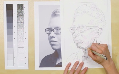 Now we're gonna move on and do the value six areas of our drawing. So you want to use your value scale to give you references to how dark to go on those areas. So you just dot along and just fill it in again. If you're like me, you like to work left to right. Just feels more comfortable. And as before, we're gonna be avoiding the areas with lots of detail like the eyes, the nose and the mouth. We'll save those for another chapter. We'll go much more in-depth into how to create those fine detail areas. And not lose all the details as you're working with dots instead of lines or brush strokes or color. So, you're probably a little worried at this point, cause it looks a bit choppy. Don't worry, we're gonna go back in right near the end and blend everything. It's gonna look gorgeous. Just filling in the areas. When you work along an edge like I'm going to now along the chin. What I like to do is actually run along the pencil line and just evenly space my dots. This way I have a line with openings in it that allows the eye to move through. So the viewer sees a line that breathes instead of a solid line. Visually this is much more comforting, and it doesn't appear as a harsh edge. So that's a little trick that I always use. And then what I like to do is kind of avoid that line as I get close to it when I fill in the rest of the area. If you put too many dots in one spot, as you probably saw on your values scale, you can start to create a solid black shape. So constantly moving around, eliminates this risk. So you can see, obviously we're gonna have to go back later because at the moment it looks like I have a very nice goatee going. All right, and if you're like me and as you're moving around you're finding all of these number four spots to number two spots that you missed, just go back and fill them in don't worry. There's no way you could have gotten them all the first time through. Some of them are so small it's hard to remember what number you put in them. So I'm just moving my picture around here so I can see the printed portrait underneath to compare, make sure I'm doing it right. You can always use the printed photo as reference. That's always a better guide then the little areas that we drew. As we go along, your perception might change of how dark an area really was. I'm going to have the neck now. So an example of going back and seeing something different later. You can see here it's a little bit lighter right under my chin that I initially put. So I'm just going to make sure I scale back a bit when I do the dots there We just have a little bit left here in the neck to do. And just go at your own pace. Pointillism, if anything, is a very slow and patient art. You can be thankful that we're not like Seurat in having to use three or four different colors you just have to worry about one. Last big area here, we have a six value. That means you have just one area left to do in the skin which is the eight and we'll be able to use our cheating technique there. If you're like me and you get bored easily, you can always jump around from the start to the finish of an area. Go from different sides of it, sometimes that's enough to break what can seem like a monotony of dots. You can certainly start to see that the portrait is taking form now. You can see the different value areas, the shadow is coming in. We're almost done here now. All right, last area. So, once you fill out the number sixes on your portrait that are in the large face are then it will be time to move on. And in the next little lesson we are going to put it in all of the eights. All right, we're in the last value for the enlargers of the face. So we're on to eight, and this is when we get to start cheating. Yay, so gonna fill in the area, get it up to about a six like we did on our value scale. And then we'll be able to put the swiggles on top of it to make it even darker. Now it gets a little difficult when you use this technique in an actual drawing is that. There are not it's not as clear cut of boundaries as it was in the value square where it was in the square. So you might not keep the exact shape as you drew out originally because the area that we are putting these dots in is the same value that we just put down. This is where you want to use your portrait as a reference, that photo I gave you, and make sure you dot in the right area. Just got one more area down here. [BLANK AUDIO] And then, the glasses are going to be about an eighth as well, so we'll fill that in in this section, since those are just a flat shape. And you can put squiggles on top. All right, so one last little area that is hiding. I'm going to do my ear. Shadows are always, obviously, generally where the eights hang out. And then we're going to go on here and do the glasses. So again, I just like to work left to right. We'll use the trick where you dot along the perimeter line. So this always makes me feel more comfortable too, I know I have a barrier that I can visually see better than just a pencil line so I know I won't cross it. And having those gaps in the outline instead of just filling it in solid. It makes it even more apparent that you dotted this entire thing. You start putting in straight solid lines, they don't appear anywhere else so they really stick out. Glasses are sometimes hard to get right, because of the angles in them. And they can certainly show that you haven't gotten your perspective right or your angles right if you've got a little kink in them. I'm constantly checking the angles when I draw glasses Also if you get the glasses angle off, then you could have droopy eyeballs [LAUGH] too wide a space between the eyes. Just going back in, making it a little bit darker. Just adding some of the squiggly lines. Try to make sure for this portrait that you have quite a few values to work with. I think filet my glasses are quite dark so, it gave you something to use your value eight and nine on. If you start to feel comfortable too, wh