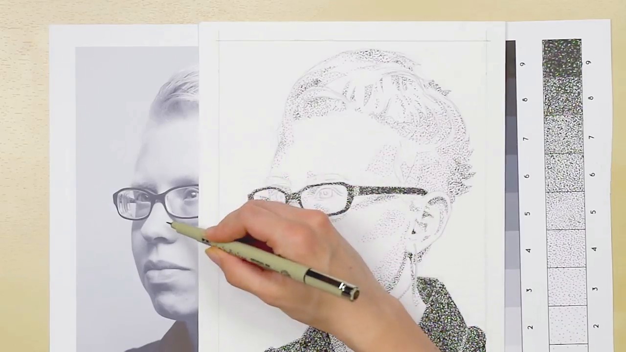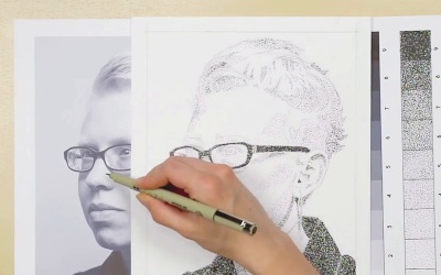 In this lesson, we're gonna move on and work on the nose. So like before, I'm just gonna show you a few tips of things to keep in mind as you ink in your nose on your final piece. And I'm sure what you're all fearful of is the dreaded pig nostrils, so I promise if you follow these tips you won't have any trouble with that. So a few key points to remember when you're inking in the nose, is to have a slightly darker area right here above the outside little ridge there. You're also gonna wanna make sure you keep a highlight above the nostril. A shadow in this case to the left where my nose starts to go under. And then when it comes to the nostril, it's actually much smaller than you might originally think because of the way that the nose actually curves around and in. So, your shadow's starting small, and then you can grow to meet the but, it's actually lighter under here. It's not the whole thing. If you were to draw the whole thing then you'll get much too large of a nostril, and it'll look like the dreaded pig nose. So let's just keep those things in mind, and I'll talk you through it as well as we move on now and start to actually ink the piece. We'll do it the same as the lips, where it's a bit more intuitive, really watching the values on the portrait. So looking at the portrait we're gonna start light and work our way dark. So even though it looks pretty light on the nose I'm gonna fill in a little bit of a value one, our value two as I go down here. You can see that there's some shadow right on the top of my nose, goes down. And then also right above that ridge like I mentioned in the intro here, go in like that, and your nose has a ridge here that connects so we'll put that in having a little bit more shadow. So as you can see here it's actually lighter on my cheek than it is on the edge of my nose. So we're gonna draw in one of those spaced, dotted lines there, and then go in and start to add the shadow on that left side of the nose that we need to really push its shape. Wanna make sure that we don't get too close to the nostril, needs to stay light there. We wanna keep this highlight right here. We're gonna go in and start to fill in the nostril and then I'm gonna go around that shape with very close dotted line. And then we're gonna out. Do the shadow on the right side of the nose. You can see it gets quite dark down here where the shadows are. Right where it meets my cheek again. And I'm just gonna carefully start to put in dots under the nostril. And don't worry if you go too dark at this point, because we're really gonna start to push the value as we start to blend. So even if it looks dark now, it's gonna look much lighter later. So once you have it all inked in and you feel comfortable with where it is, we're gonna move on and work on the eyes next.