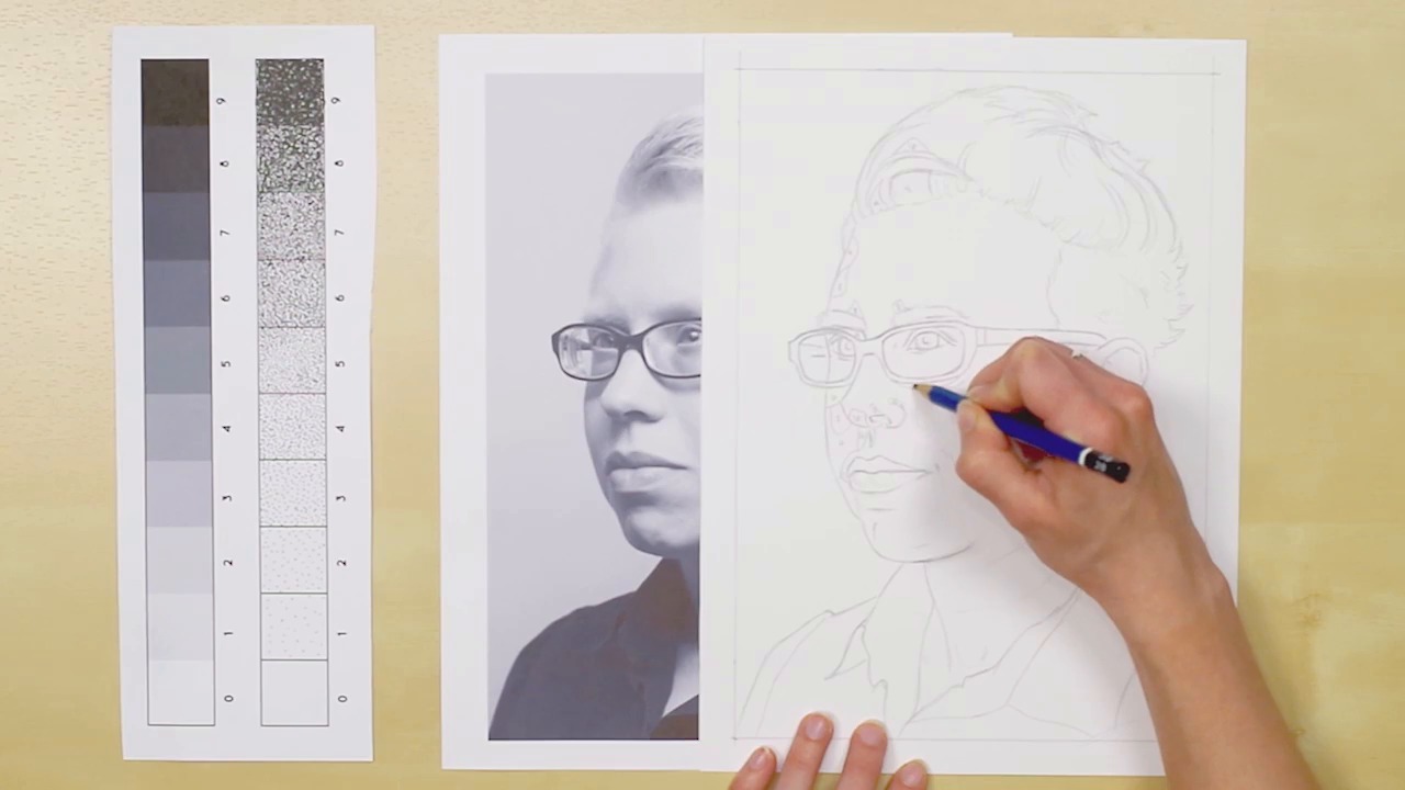 In this lesson, we’ll be setting things up for a very easy, first pointillism portrait. Using your gradation scale and the reference photo, pencil in value areas. Think of it like creating a paint-by-number painting or a topographical map. You can look at the value area JPEG I provided to see how I divided up my drawing.