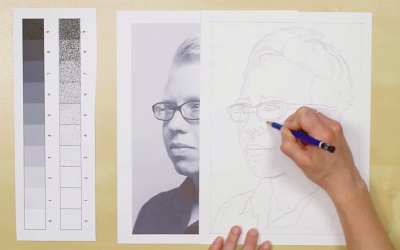 Now that we have our sketch drawn out, we're gonna start putting in the value areas. When you learn pointillism for the first time, it's a really good idea to follow this method, because it's actually going to create an almost paint by numbers effect on the drawing. So we're gonna be using the value scale that we created earlier. The photo as a reference, and then also the sketch that we made. So when we drew out the value scale, we learned zero though nine. However when we draw the areas onto our sketch we're actually only going to draw out the even numbers. This is because we are going to be blending later. And the blending will create that odd number value. You don't want to have a jump that goes zero to two on a final piece. So, by first inking in the two areas. Leaving the whitest white to zero. We'll then go back in later, add just a few dots to blend it to white. And those few dots will equal an area of value of one. So, this makes it much easier also to see on the sketch. Because if you have all nine numbers on here, it gets pretty crazy. So you can walk through it with me. I've also provided as a reference tool, this drawing with all the value areas drawn in and numbered for your convenience. So, starting easy, you see the shadow under my glasses so I'm going to draw in just that shape and looking at my value scale, it is going to be a six. So I like to write in the numbers because that way I know what it is later. Sometimes I forget and I just have all these areas and it gets a little bit difficult. So I've got a two and a four here. I'm also drawing quite dark, you want to go much lighter than I am so that you can erase it later. So you can see, as we go along here, why it's always a good idea to go with just the even numbers instead of all of them because it started getting a bit busy. So this here is a four. It's right up in here, it's actually lighter here for a two. It's also why you might want to use a picture of somebody else cuz if it's you, you start to look quite funny after a while. This might remind you of, as I mentioned earlier, those paint by numbers. I don't know about you but I did quite a bit of those as a child. And that's kind of the approach that I take here. Especially for people who haven't done this before, it makes it much less intimidating. So you're just gonna work your way through, figuring out. My glasses are obviously gonna be an eight. And this shirt, pretty much the whole shirt's gonna be an eight. There are just some little bits here where it catches the light. That'd be a six. But don't worry about missing areas. When you start to actually go in, you'll, With a pen, you'll cover all of them again, you'll see things you didn't see the first time. It's just the way this goes. That also shows that you're getting better at seeing value if you go in and change things. And as always, they're just reference points. Nothing is set in stone. So we're just going along. As you get more comfortable with this method you can do it much more intuitively. The way that I usually draw is just going by feel. And just looking at the values as I go. There's another full line of hair. My hair is quite light so it makes it easy for you. Six back there, shadows in the ears. And don't worry if you need to bump things up as you go along. Now, if you get to an area and you marked it as a six, it has to go up to an eight, that's easy. Also at this point, don't worry too much about going too dark. There are some tricks I will show you on how to fix that. All right. So you've got just about all of the major areas laid out. So once you're done with yours and you've got it all set, Then, you'll be ready to move on to the next step, where we are going to actually get to start inking finally. So it looks a little frightening, but this is gonna really make it comfortable as we move on to the next step, which is inking our drawing.