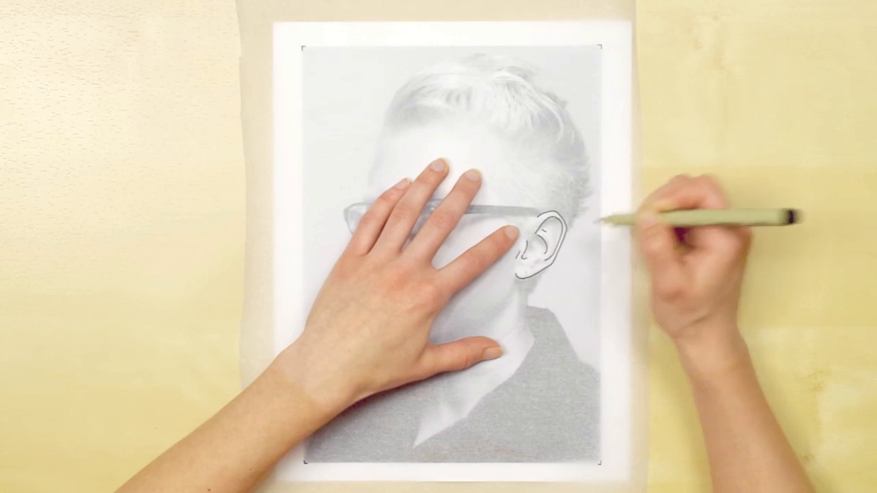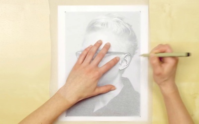 Now that you have your gradation scale finished and you're feeling much more comfortable with your pen, we're gonna move on and start the portrait. But, before we do that, we have to sketch it. So, you'll want to print out the black and white portrait that I've provided you. And keep it the same scale that it is because this is a really great size. To learn how to ink the detailed areas of the face like the eyes and the nose. You'll also want a piece of bristol that you can use as your drawing paper. I really like bristol because its smooth surface allows the ink to sit on top. Now, depending on how comfortable you are with sketching, you'll either just free hand draw the portrait onto your paper, or if you prefer to use a tracing method, I'll be showing you a technique that I really like to use. And in addition to the other supplies, you'll just need a piece of tracing paper. You'll want to make sure you have a B pencil, anywhere from a 2B to a 6B. You'll need your micron pen that you've been using so far and a white eraser. So once you've got all your supplies gathered, just let's go forward and start sketching our piece. So the first step in tracing your portrait, is to print out the photograph, like I talked about before at scale. Then you're going to take a piece of tracing paper, And lay it down on top. You will take your pen and mark off the corners of the portrait. You might also want to tape the top and bottom or the sides of the paper down to the table. And that way in case it moves around, you can, the tape will hold it. And if you're not using tape you can easily realign with the little marks in the corners. So for the sake of this tutorial, I'm just gonna go through a small section of the portrait. But you'll be applying these steps to the entirety of it. So the first thing you want to do is to take your pen and to draw out the outlines, or the contours of the drawing, of the portrait below. So here I'm drawing out all the little ridges in my ear. You don't have to get too detailed because you'll be referring to the portrait to go back in and sketch things in later. But you want to have enough that you can easily identify where areas are. So now that you've got your whole outline done, for me it's my ear. You're going to flip over your tracing paper. [SOUND] And you're gonna use a soft B pencil, I'm using 3B. And rub over the ink. You're just laying down a layer of graphite. That we'll use for the transfer process. So you'll do this for your whole portrait. And you're welcome to leave big areas white if there's nothing in them. And you're gonna flip your tracing paper back over. And you're gonna use the little marks that you drew earlier to line up with the margins of your bristol paper. And then you're going to take your pencil, again, and you're going to apply a little bit of pressure as you go over your pen lines. A second time. So the pressure that you use, it doesn't have to be too hard, but you need a little bit. The pressure actually pushes the graphite onto the paper. And that way when you take your tracing paper away and we'll just see your sketch. So you're gonna take your tracing paper away once you're done. And you can see that it left a nice outline for us to use and you can go back in. And I would suggest using a much lighter pencil than I am. You go back in and trace over the lines. You can use the photo as reference to figure out where all the little areas are. Make sure things line up and make sure you traced it correctly. You'll wanna use a lighter pencil so that you can easily erase it at the end of our project. So once you have your whole portrait sketched out, you'll be ready to move on with me to the next lesson, where we are gonna draw in our value areas.