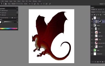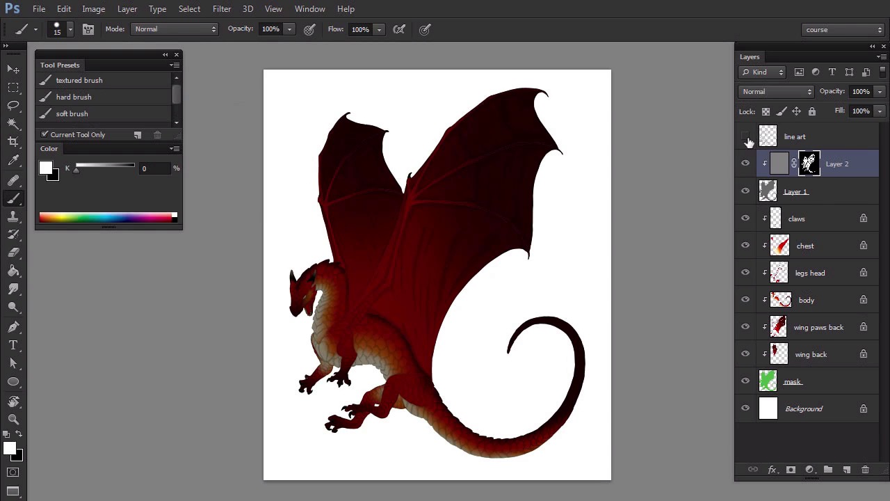 Hi. Welcome back to simple coloring and shading a liner in Adobe Photoshop. My name is Moniquas Egroberda and this part we're going to work on ambient light, circumferendary light and the shadows. Create a new layer under the line art. Hold control and click the sublet of the mask to create the selection. Then grab the paint bucket tool to fill the selection with 40% gray. Deselect when you're done. To make the shadow layer transparent, set its blend mode to multiply. Now we need to unclip the shadow layer to make a separate mask. Create a new layer and clip it to the layer below. Change the color to 50% gray and fill the layer with it. Add the layer mask to the layer then switch to black, and fill the mask with it. This will make the layer disappear. To reveal the parts we want visible, we just need to paint on it with white. Use a hard brush to remove the shadow from every scale leaving a bit of the darkness in the crevices. This is what we call ambient occlusion. No matter where the light source is, it will never reach certain places like small cracks or slates. We can use this attribute to visual justify lines of the line art. If you're more advanced, you can even use this phase to get rid of the line art completely. Keep in mind that you're painting on the layer mask, so if you make a mistake, just paint it black to make it disappear. If you don't feel comfortable doing it to the mouse, You can draw the light by selecting the part with the lasso tool or the pen tool. However, the shapes we're painting here won't be visible from a distance so they don't need to be overly clean. Feel free to do it quickly, loosely, but without crossing the lines. When you're done, you should be able to see a trace of the line art even after hiding its layer. This is what our dragon looks like in a neutral, ambient light. Let's create another kind of light, create a new layer and clip it. Set the color to 70% grey. This is much brighter than our previous 50% so it will make quite a strong light. We want to illuminate the center of every part of the body with it to give it a 3D feel. This is where the smaller clipping masks step in. We can make a selection of any of them to limit the area we paint on. This way we can paint quickly without thinking about the parts we shouldn't cross. Paint a big fat stroke in the middle of the body, far from the outline. It will make it look as if the main part was closer to us. Then illuminate only parts of the skies on the border between the light and shadow. Your goal is to make the transition more gradual and natural to hide that stroke you started with. To make the border even less aggressive, add the layer mask. Take a soft brush and paint on it with black. If you're not using tablet, make the stroke subtler by lowering the opacity. Be careful here. We don't want the border to disappear. Use this method to shade every part of the body. To wrap it up, make a selection for the part you want to shade, paint a big stroke with 70% gray. Paint this case on the borders, add the layer mask, and soften the borders with a soft brush. Try to do it uniformly, the same style for every part. Keep in mind, the dark colors don't get much brighter in light, so it's normal if some areas won't react to actions at all. Congratulations, the dragon is now shaded according to our neutral lighting. In the next part, we're going to create more dramatic effects by adding the primary light.