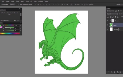 Hi, welcome back to simple coloring and shading of line art in Adobe Photoshop. My name is Monica Zudrobera and in this part I'm going to show you how to prepare a line art for painting. A line art is supposed to define limits of the painting we want to create. On the other hand we want to paint freely, spontaneously, without limits. To bring these two concepts together we can use something called the clipping mask. A clipping mask is a shape usually painted with a hard brush and a solid color. It doesn't do anything on its own, for this to work, you must clip a layer to it. Let's create a new layer and clip it to the mask by holding ALT key and clicking the line between them. Now, if you paint anything on that clipped layer it will not cross the edges of the mask below. You can clip as many layers as you want to a single mask as long as they're placed directly above each other. If you create the new layer between two clipped ones, it will automatically clip itself. Let's see how to use this tool in our case. What we need to do is to separate the area of the dragon body from the background. The easiest way to do it is to use the magic wand tool on the background and then invert the selection. Then you can create a new layer and fill it with the paint bucket tool. Deselect to finish the process. However, it works only if your line art is clean and precise. If it's just a sketch, the mask will be ragged. In this case, you may need to draw the mask yourself using the hard brush. Create a new layer and draw the outline of the dragon without any gaps. Then you can use the same technique as in the previous method. If you don't have a tablet, drawing the outline may be very problematic. In this case you should use the pen tool. Okay the mask is done. Let's put the line art above the mask and clip it. If you create a new layer between them and paint on it, you can freely color the dragon without any risk of crossing the outline. But what if you wanted to, let's say, paint the belly of the dragon with a different color than the rest of the body. You could paint very carefully and erase the color from the legs, but painting isn't about controlling yourself, is it? It's also very hard to do it properly without a tablet. The solution is to create more clip masks. Unfortunately Photoshop doesn't allow us to create multiple levels of clip mask, so we need to use a trick. First, use the same method as before to paint the parts of the body you'd like to have separate. Use bright, vivid colors for these masks. Create a new layer for each part, or group of parts, and try to make as few of them as possible. These masks are incompleted. If you select them by holding control key and clicking the layer's thumbnail you'll see the real shape concealed by the main clipping mask. In order to remove that redundant part, select the main clipping mask, invert the selection, click the layer you want to clean and cut the selected part. Do the same with every part. There's one more thing. The masks cover each other partially, so they may overlap. We must remove the overlapping to get really clean masks. Set it to one part and get the selection from every other part. Then do the same with every mask. Select each part one by one and see if only the edges of the part are selected. Before we get to coloring, lock your pixels for every layer. This works like a clipping mask within a clipping mask. Give each layer a name that will point you to the part of the body it covers. Now is the most fun part, use any brush you like and add the colors. You don't need to think about the edges so you can even paint with the mouse. Just remember to paint on proper layers. Don't think about lighting and shading yet. Use bright colors as if the dragon was illuminated by the strongest lights as possible coming from all directions. The coloring is done. In next part, we're going to take care of shading starting with ambient light, secondary light, and their shadows.
