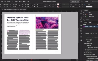 Hi there and welcome back to this course. In this lesson I will show you the three essential steps you need to take if you're going to import images into InDesign. So let's say you have you're layout ready to go, and now you need to start importing images. Many designers neglect this part, which is really a problem because if you are working on a magazine and have all the images already in there, send this PDF to your client, and the client approves everything. But then you get a surprise after printing that the colors are not matching or they don't look the same. That's because we forgot to convert these images or maybe they're pixelated, and that can get very, very costly if you have to reprint them a whole magazine, a whole editorial project. I want to open this image with Adobe Photoshop, and the important part here is to check for Mode. I want to transfer this from RBG to CMYK. So head over to Image>Mode>CMYK Color, click OK, and it's converted. Next we want to check for the resolution. If you acquire a lot of images online, they will unfortunately be most likely 72 DPI. 72 is only for screens. If you want to print an image, it has to be at 300 DPI. This image is from Envato Elements, so they already know that we as designers take resolution very seriously. And that really dictates how big an image can go. So this is already set to 300 DPI. Of course if you were using it for web, you can change this to 72. That's not a problem. And then the image size will go smaller, which is really helpful if you want to work with a lighter file. So let's put this back to 300 and add an _R. So for me, that's how I save all my files, _R at the end, when I've already converted them to CMYK and 300 DPI. That means R for revised. Click Save, back to InDesign. Make sure that you're selecting the file that is revised, place it into InDesign, and resize. Head over to the Links panel, in here you will see some link info. And this is useful if you have already a ton of images into InDesign and you want to quickly check their colorspace and size. So here I can see that the format is JPEG, colorspace CMYK, perfect, Actual PPI 300, and then we'll go here, lower, and check on the scale. So the scale is 50%, that means that we're using the image at half its original size, so half the size that it can actually be used. So if I want to make this bigger, this scale will change. And now, I'm using it at 100%. You can also check that here at the top. Now let's say I make this bigger, and we can already see this getting slightly pixelated. An image can be used up to 120%. Ideally, you should keep it under 100, but you can use it up to 120%. So I want to go back to a couple of lessons ago where we talked about file organization. Another great advantage is that if you make any changes to the image that you're using in the file, and it's properly linked, all the changes that you make on that image are going to be affect it in the file. So for instance, I'll open the image in Photoshop, and let's say I want to change the color, and because we have a layer on top, I'll save this as a TIFF. So I'll put R version 2, TIFF, click OK, head back into InDesign, Import the image there. So let's do our usual links check, CMYK, 300 DPI, 52%. So let's say that the client wants a different color, they don't like the blue, they want a totally different color. I'll open the TIFF file, change the color, save it. Close Photoshop, head over to InDesign, and you'll notice this warning symbol next to the image on the Links panel. Double-click on that, and the image will automatically update. So this is a great way to handle an image file especially if you will be making pre-touches on top of that. So now that we've covered all the components that you need in print design, we'll touch on how to create impact in your design. In the next lesson, I will show you five ways to keep your readers engaged and interested in your layout. I'll see you there.