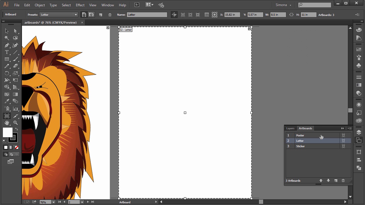 Hi, my name is Simona, and welcome to tuts+. You are watching the course The Fundamentals of Adobe Illustrator, and this is lesson Artboards. In this lesson, we will be looking at the Artboard panel in Adobe Illustrator CC, and how to use the Artboard options. So let's get started. So let's create a new document and call it art boards. Select tabloid from the drop down menu. We now just have a blank art board in the size of 11 by 17 inches. I already copied the line illustration we will be creating in this course to the clip board. So I will just add it so we have a little bit of a visual interest. And here we go. Artboards are great if you want to have different sizes and different elements all within one document. Now let's say that you would like to have another small poster of illustrational artwork. For example in letter size. We can now add another artwork to our document. We have several ways to add a new artwork. Either by choosing the artwork tool, the shortcut is shift plus O, or via the artwork panel. If you do not see the artwork panel on the right side. Just go to windows and select art boards. So let's have a closer look at the art boards panel. As you can see in the art boards panel, we currently have one art board called Art Board 1. You can rename the art board easily by just double clicking the name and giving it the name Poster. Or we can use the art board tool from the tool panel and the art board will automatically be highlighted and in the control panel on top, you can rename it as well. Now let's add another art board and letter size. Watch the cursor showing a plus with a square attached. Now if I hold down the mouse key and start dragging, I will add another art board to the canvas. Just like this. You can see the size of it here at the bottom right. Now I won't be able to be exactly accurate and have a new art board in the other size. But Illustrator lets me adjust the size and set exact dimensions. You can see that the art board is highlighted via a dashed line, a number telling me it's the second art board, and the default name. So let's go to the control bar up here, and let's type 8.5 inches for the width, just in here, and 11 inches for the height, just over there. This gives us letter size artboard. If you like to align it with the first artboard, you can drag it and move it around and place it where you think it's best suited. The only thing we have to pay attention to, that it is selected, which the dashed line will tell us that it is. Now in our art boards panel, the new art board is listed. I don't really care for the name so let's rename it and call it Letter. Again, we can just do so by double clicking on it, and typing letter. Now, if you decided to get some stickers printed of your artwork. Well, let's add another art board to the canvas. This time, will use the art board's panel. Click on the new art board icon. See what happened? A new artwork with the exact same size as the one before was added. Of course this would be a big sticker. So we want to resize it again. Let's say we want the sticker in the size of, 2 by 3 inches. All we have to do is add those dimensions up in the control bar again. 2 inches for the width and 3 inches for the height. And then we move it down a bit. Of course the name makes no sense again so let's double click on the name in the outports panel. See what happened? We automatically zoomed in center to our canvas. This is really a neat feature. And no matter how many outputs you have, you do not have to go hunting for them. Just double click on the output layer. Just like that. And we will bring it into the middle of our window. Now, let's change the name of the sticker artwork to "sticker". Double click it. And we type ticker. Maybe we will add one more art port in postcard size. So In new art port, the size is 4 x 6 inches. And we will call that postcard. And drag it over here. I bet by now you're pretty familiar with art boards. Now we have four Artboards in different sizes. Name neatly and numbered from one to four. If we needed to change any of the settings of the Artboard, we can easily do this by clicking on the icon here on the right. And the dialog box for the Artboard options will pop up. There we can change size, position, and so forth. Now let me add some of the lion faces to the art boards. One for the letter size. I will resize it so it fits. I copy another one for the postcard, and resize it. And a small one for the sticker. Now since you have noticed that the art boards are all listed in the Art Boards Panel, we can change the order there of them, of course, too. You can either drag them around, up and down just like this or use the up and down arrows here. Notice artwork and art board position will not change. Just the ordering number, which can be helpful for printing only one of the outputs. You can also delete an output, either via the outputs panel or the output tool. Let me show you how. Just click on the trash can icon and the output will be deleted. See how the artwork will not be effected? You can also use the artboard tool and click the small x on the top right to close an artboard. Since we know that each artboard is numbered, we can easily print only that number without printing the others. Just remember the output number you would like to print and in your print dialogue box choose to arrange instead of all for artboards put more later on you can also duplicate an existing art board let's have a look at the control panel here select the art board tool In the control panel you can then choose tabloid art board, which is selected. Now when you click on the new art board icon here, and you move the mouse over the canvas, you can place the new duplicate art board of the tablet size anywhere. If you wanted multiple duplicates just press the alt key and click. And place as many as you wish, just like this. You can do the same via the art board panel. Just click on the art board you would like to dup