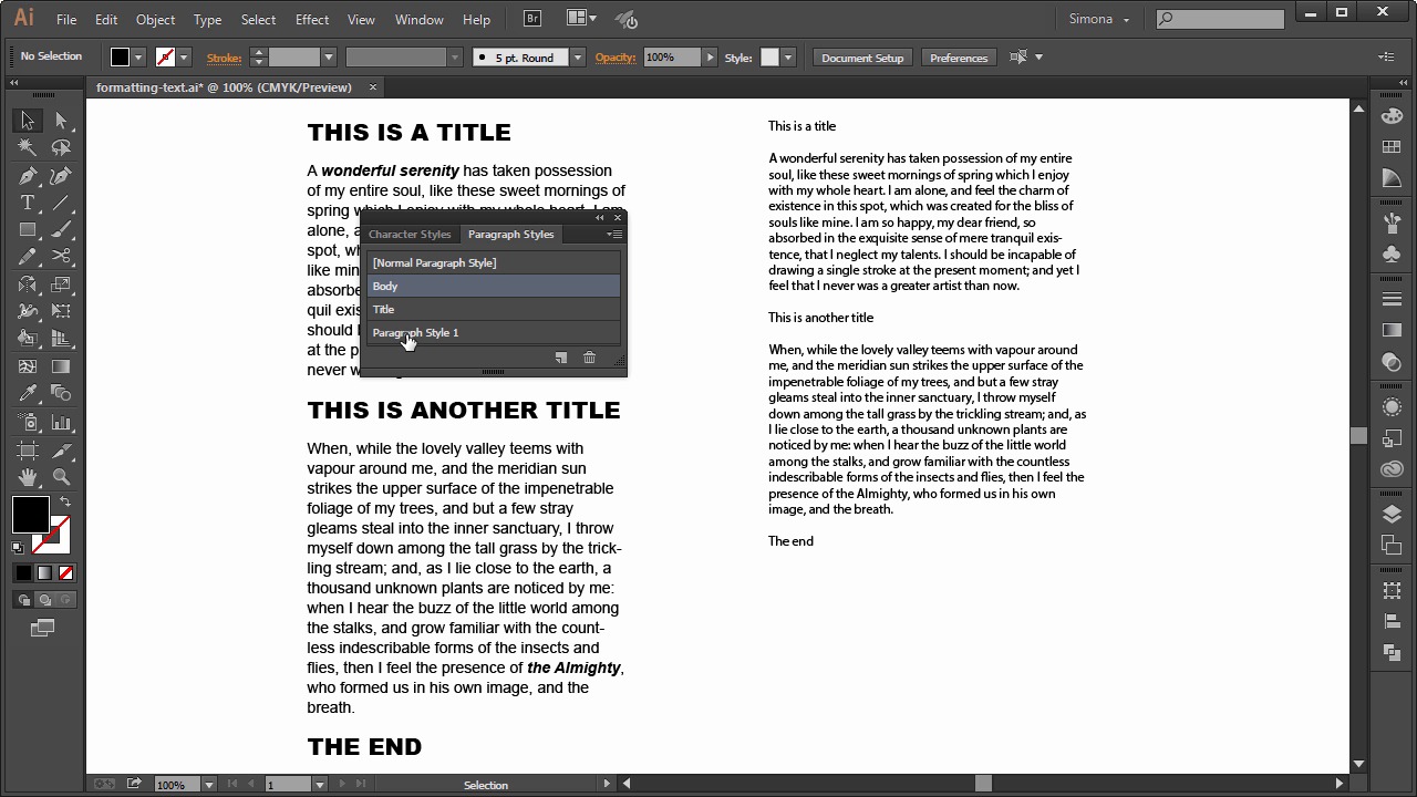 Hi, my name is Simona and welcome to Tuts+. You are watching the course The Fundamentals of Adobe Illustrator and this is lesson Formatting Text. In this lesson, we will learn how to format text, and apply character styles, and paragraph styles. So let's get started right away. Open up Adobe Illustrator in the exercise file called Formatting Text. A character style is like a collection of character formatting attributes that we can apply to a text, and a paragraph style includes both the character and paragraph formatting attributes. Both we can apply to a selected paragraph or several paragraphs. This saves us time and we can apply a consistent to a text. So let me show you how we can use it. As you can see, I already created several paragraphs. And I use the area type form. On the left you can see the character and paragraph styles applied. And on the right text, it is unformatted. So let me demonstrate how we can use the styles. Let's open up the character and paragraph styles under Window > Type > Paragraph Styles. Both the Character and Paragraph Styles are nested. In the panel we can see that I created two new paragraphs styles. One called Body, and the other called Title. We also see in brackets the normal paragraph style, which is the default. Now when we double-click the style, it is imported that we have nothing selected. We will see a Paragraph Style Options panel. Here we can set everything. Here we can set how we want our paragraph to look. From Size, Font, Leading, Color, and so forth. Now it is up to you how you would like to format your text and please play around. There is no rule on what font or size or style. If you want to create a new style, all you have to do is click on the create new style icon here and a new paragraph style is added with a default name. And we can change it by double clicking and then in the options panel, we can set name, font size, and so forth. If you would like to get rid of the style, just click on it once and then select the trash can icon. Just make sure that no text is selected. Now let's apply the style to the text on the right. And you will see why styles are so neat. So let's double-click on the text to make it active. Then all we need to do is set the cursor onto the title here. And then in the Paragraph Styles, we click on the style Title. We don't have to select the whole text, just place the cursor on it. It will detect a paragraph and the style is applied to it. Then when we place the cursor on the next paragraph. And then we select the style body. Then, we do the title again. And then the next paragraph, we select body again, and then one more title. Now, if you want to change just one or two words. And we know the same style we want to maybe add to other words in the paragraph, we can use the character style. All we need to do is select the words that we want to format and then click on the character style to create it. Now we also can edit styles, so for example, let's edit the title style. So we double-click it, then we go an change for example, the character color. And then we click OK. Now all title styles applied to the text have been changed. And this is the strength of the character and paragraph style. And of course we can apply a multitude of formatting, but we will stop here for now. And now we are the end of this lesson about formatting text with character styles and paragraph styles. This is really just an intro. There are many, many more features to paragraph styles and character styles, but these styles can really save time. And add an inconsistency to a block of text. But, let's move on to the next lesson and learn more about special text techniques.