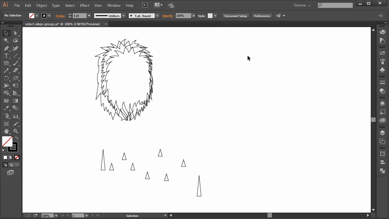 Hi, my name is Simona, and welcome to tuts+. You are watching the course The Fundamentals of Adobe Illustrator, and this is lesson Select, Align, and Group. In this lesson, we will learn all about the selection tools, how to align objects, and how to group them. So let's get started. Open up Adobe Illustrator and the exercise file called Select Line Group in your source file folder. I placed a few vector objects that we have for the lion illustration on separate layers. Now here we have the main object for the lion. The one on the right we created with the pen tool. And the one in the middle is similar to the first one we created with the pencil tool. So just to quickly talk about the selection tools. We already know about the selection tool and the direct selection tool. The first will select the whole object just like this. The direct selection tool, the anchor points, if you click on them. Now in the toolbar, we have a tool for selecting, called the lasso tool. A similar tool exists in Photoshop, so you might be familiar with the term. And it sort of works a little bit like it. You can select a group of vector objects by drawing a lasso around them, or even just a group of anchor points. Another way to select objects is the keyboard shortcut Ctrl or Cmd+A, or by going to Select, then click All. If one object is selected and you want to select either the next object above, or the next object below in the layer, just choose Ctrl, or Cmd on the Mac, and Alt, or Option key on the Mac. Press the open bracket key or the closed bracket key. See how we can cycle through the objects? Next, let's talk about to align shapes or objects. When aligning shapes, you have two major options. One to align them to each other, or to align them onto the art board. So, let me demonstrate the tool. When we select all the lion shapes, and then we go up to the control panel. In here we see several options. Here in the drop-down, we have Align to Selection, Align to Key Object, and Align to Artboard. So let's start with the first one. Align the Left Edge, or Align to Center, Align to Right Edge, Align to Top, Align to Center Horizontally, and Align to Bottom. When we select the Align to Key Object, the center object is selected and all other objects will be aligned to it. We can easily change the key object by clicking on another selection. And you can see that the selection outlines it in a kind of thicker blue. So, let's quickly go through a few align options to demonstrate it. I selected the right as the key object, and watch how the others will be aligned with it. Then we have the align options to align everything to the Artboard. Now, all we have to do is select Align to Artboard. And then, for example, we hit the Align to Left, and all selected shapes jump to the left edge of the Artboard. Or we choose center, and everything will be aligned to the center of the Artboard. Now, if I want to align the teeth like shapes, and align them to the bottom of the big teeth shape, all I have to do is select them all by creating a rectangle with the selection tool around them, and then I click the big tooth to make it a key selection and then, up here, I hit the bottom align. I then can select and distribute them by hitting the horizontal distribute center tool. And by the way, the Align Panel is also available in the Tool Panels of the work space. Now let's group the lion shapes. All we have to do is select them all, and then go to object group, or press Ctrl, or Cmd on the Mac, plus G. Now the three shapes are grouped and we can move them around by selecting them only once. This is really helpful when you have tons of shapes that sort of belong together, and you need to duplicate them or move them without having to click a thousand shapes. We can still access each shape singly though. Just double-click the shape, and see on the top left here, it says Layer 1 group. We are now within this group, and we can select the shapes individually with the selection tool. You can leave the group simply by double-clicking anywhere on the Artboard. And this is it of this lesson. These tools, like Select, and Align, and Group don't mean much at first. But they can become super helpful when working with tons of shapes and objects that you need to group, or align, or select individually. So let's go to the next lesson and learn how to transform, rotate, shear, duplicate, and reflect shapes or objects.