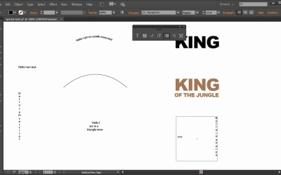 Hi, my name is Simona, and welcome to tuts+. You are watching the course, the Fundamentals of Adobe Illustrator, and this is lesson, Special Texts Techniques. In this lesson, we will learn how to use the type tool on a path, inside an object and how to use the new feature called the touch type tool. So, let's get started. Open up Adobe Illustrator and the exercise file called Special Text in your source file folder. We played around with the type tool before, and now, I would like to show you what else we can do with it. So, let's separate the type tool panel from the tool panel over here. The first tool is the type tool, remember we selected, then we clicked once and we can start typing. Next, we have the area type tool. It is not like the one we used creating a block of text before. This tool lets us actually add text to a shape or object, and it really places the text inside the shape or object. For example, when we select the tool and then click on the triangle path here, the tool will convert the shape into an area where we can type text. And as you can see, the stroke will not be visible anymore of the triangle. And all the text will be squeezed into this shape. Another often tool that is used is the type on path tool. I created the path for us. Then, when we select Tool and then click on the path, we can start typing on this particular path we've chosen. Then, when we deselect and choose the selection tool, we can drag via these handles the text along this path. And if we choose the type tool again, we can then add more text or take text away as long as the path will hold all the text. We can also add vertical text via this tool here. So, with the vertical text tool selected, we click once and then we can start typing away in a vertical line. Same as the area type tool, we have the vertical area type tool. So, we selected, then click on the path of the shape here and then retype the text. And as you can see, we are start typing vertically and it will all be squeezed into the shape. The next tool is the vertical type on a path. And just like the type on the path tool, it works the same, just vertical. So, we will choose it, and then we click on this path here, and then we will start typing. And then, we have the touch type tool. This tool is new and it's really cool for altering characters within a word. Let me show you. Here, we have the word king. Now, if we wanted to change only one character or even several, but each in a different way, in the past, we would have to outline the text, separate the shapes, and then transform them individually. And we would lose the live text and we wouldn't be able to change the text afterwards. Now, with the new touch type tool, we can do this on the fly. So, here we go. We select the touch type tool, and then we can alter each character however we want. I can select this one, and then rotate it or move it. Then, I select another one. Make it smaller. Rotate it too. And then the next one. And move it as well, rotate a little, maybe a little bit bigger. And the last one, I just rotate and make a little smaller. Now, when I select the type tool again, I can still access the characters and I can change the text. Just like this. Now, just to let you know, why it's called touch type tool. It's because, if you have a touch screen or a Wacom tablet with a touch pad or a Cintiq, you can simply use this tool and touch the characters and transform them right on the screen. Now, isn't this cool, or what? And one more thing before we end this lesson, let me show you quickly how to outline texts and make it into a shape. So, let's select a text here and then we go to Type > Create Outlines. And, now we have shapes. The live text is taken away, so we cannot change the text anymore. But, we can transform now the shape into anything we want. And now, we are at the end of this lesson about special text techniques. So, let's move on to the next lesson and learn how to save our file in different formats.