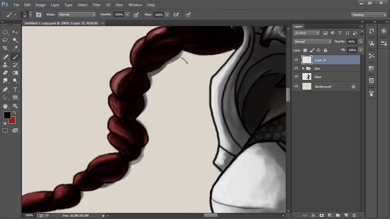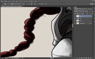 Hi, and welcome to The Fundamentals of Digital Painting. My name is Nas Peters. And in this video we are going to be painting hair. We will be relying on the line art and the shape it already has as well as create a brush which will allow us to paint several hair strokes at a time rather than painting them one by one. This will simplify the process. We are going to start off by making a new brush. Create a new layer and then select the round, hard edged brush. Size it down somewhere between 10 and 20. Pick the color black and focus on a blank spot on the canvas. Now, paint small dots in a row. I decided to go with five, each a different size. Then just like we did to create the other brushes, we want to hide the background layer and use the laso tool to create a selection around these dots. Continue to turn it into a brush by going into Edit > Define Brush Preset. Title it if you want and then click OK. You can now unhide the background layer. We want to test out the new brush and see how the ceilings react on the brushstrokes. You'll notice the dots are scattered, rather than linear shaped. So go into the brush settings to tweak this. If you were to uncheck the shape dynamics, it will create a linear trajectory. But you can still see the dot shapes in these lines, so we need to tweak the settings so it smooths out. To do this I select the shade dynamics again and tweak the angle jitter around this jitter to create the linear shape of the brush. Once that's done I test a brush out again. There's still a bit of roundness but we won't be using the brush at a large size as the one I have selected at the moment. So the dotted aspect will fade the smaller the brush size is. Erase the dots you made to create your brush from or delete that layer and create a new one to paint the hair on. Zoom in on the top of the character's head and size down the dotted brush we just made. It can be quite small. I have mine at 12. Large enough so you can see the shape of the brush but not so big that the dotted aspect transfers into strokes. I select a black color and focus on the shaded areas. This brush will help thicken the hair giving it the illusion of multiple layers and thinner strands of hair which pop out the hairdo, making it look more natural. Because of the settings we applied on the brush, we don't need to load the opacity or flow. Gently paint over the darkest areas, hiding the line art, bit by bit, so the red blends into the shadows rather than being cut off in the line art sections. You can use the same dotted brush on the eraser tool and leave strands that came out too thick. It's okay if it goes outside of the lines a bit. Once you're done hide and unhide the layer to see the difference so far. If you find it too dark, lower the opacity on the layer just a bit so the red can become more visible underneath. Just make sure the shape doesn't rely on the line art as much as it did before. Clean up some of the messy areas if need be with the eraser and brush tools. Moving on to the next step. Create new layer on top of the one we just finished. We're going to keep using the same brush, only changing the color. I'm going to be using a lighter and more vibrant red. If you happen to have used a different color for the hair, simply use a lighter and more vibrant color than the one you have the hair as. For this we do want to lower the opacity in the brush as we want the shading nuances to be visible underneath our painting. I lowered the opacity on the brush to 70%. Now, just like we did with the black, we want to paint some strokes over to the lightest areas in the hair, filling it out a bit and giving the shape more volume. We will be using a blending mode on this layer so don't worry if you happen to cover dark areas. Once done change the blending mode to either overlay, soft light or color dodge. I personally went with overlay but those three modes will compliment the highlights although color dodge may come out quite harshly. I actually lowered the opacity underlay to 80% as I find overlay to be a bit too flashy as well. Now, repeat this exact same process only with an even lighter color. For red I will be using a very light pink. You also want to make the brush size smaller as this will act as the thinner strands that are highlighted across the hair. Make sure to create a new layer for this. As you can see I avoided painting strands in the side of her hair which has most shadow. Only covering the areas which contain most light. For this layers blending mode you do want to opt for color dodge. It'll help make those strands pop out from the rest of the colors. If it's too vibrant lower the opacity on layer just a bit. Now, if you place all the hair layers in to it's own folder you can hide and unhide it to see the difference from before and after real quick. The hair now holds more contrast, looks a bit thicker and the colors flow through the strands. You can continue adding to the hair, adding more layers with a dotted brush or using the round hard edge brush at a very low size to add very small individual strands of hair to give it a more threaded aspect. You won't be able to notice these very much, unless you were to look at the illustration, zoomed in. But adding details is a lot of un. You could call it complete, or add some different color shades to the hair. For this we will use one of the custom color brushes we made. It can be relatively big size, as it's like smudging colors onto the hair, rather than painting precisely. I decide to go for a very flashy purple with tints of blue in it and focus the paint smudges mostly in the contrasted areas. The opacity is set pretty low on the brush, so the brush strokes aren't as hard edged. Once done, tweak a blending mode under layer and change the opacity if need be. And that's it. We are done with the hair. In the next video, we are going to start painting different textures, starting off with fabrics. Thanks for listening.