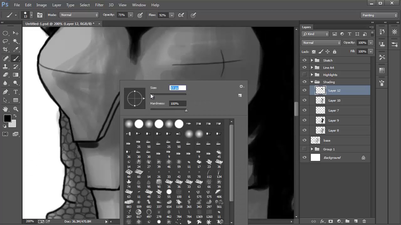 Hi, and welcome to the fundamentals of digital painting. My name is Nas Peters and in this video we are going to continue working on the grayscale. We will be making the details of the character more prominent, which will allow for more depth in the illustration. As we did in the previous grayscale video, we are going to be using the brush tool, opacity levels and fill percentage, as well as changing the brush size throughout. We will be creating new and separate layers for the shades and the highlights and applying different blending modes and opacity levels on these two. And we'll of course use the eraser tool as well when you make little mistakes here or there or need to adjust a brush stroke. By now you'll be a bit more comfortable using shortcuts and or will find it easier to locate the tools in the toolbar. Due to this I won't be repeating the shortcuts as often as I did in the previous videos. It's not a race though, so take your time and use a cheat sheet if you need it, or go back to the shortcut video to refresh your memory. Where we used relatively large brush sizes in the previous grayscale video, we are going to be using a much thinner brush this time around. Create a new layer on top of all the other shading and highlight layers and aim for a brush size between five and ten px. The other shading layers are quite low in the pass view. This is so it blends well with the base grey color, where as the shading layer we are going to paint now will be much darker creating a new nuance and adding more depth to the painting. Once you have chosen your brush size, zoom in and pick an area you want to start on. I'm starting off with the hair. You'll notice that I'm basically following the liner which is most covered by the other shading layers. Use the hand tool to move the canvas around as you continue to apply the shade. You want to fill in the darkest areas again but also extenuate the shape of what you're painting by contouring the liner with thin brush strokes. With the hair, you want to use the shading layer to separate the strands from one another with a shadow. For the face, you want to touch the features which are either surrounded by more prominent features. For example the eye sockets are more deeply settled in to the skull and surrounded by a brown cheekbones, as well as temples and the bridge of the nose. All these cast a shadow on the eye socket, making this a darker area than other parts of the face. Considering the light source, the underside of her nose is not in direct contact with light so you can add a shadow there. More often than not, one lip is more shadowcast than another. Usually it is the upper lip as the bottom one protrudes further forward than the upper one. We want to contour the face with shadows as well as her face is completely surrounded by hair. So the hair would cast a shadow onto her forehead and cheeks. You can use a much larger brush lowering the opacity to fill in the darker side of her face. In this case that would be the right side. Press down lightly with your tablet pen and cover the side of her face with a heavier shadow. You can use circular motions to blend it in with the harsher shadow along the edge of her face. If you're finding pen pressure a bit tricky just lower the opacity way down so the brush strokes won't risk being too dark. Remember that it's okay to fill entire sections off with a shadow. Even if you feel you are losing detail in the illustration, contrasting elements and materials will give you a much more in-depth result. I sometimes use a different brush that has a square aspect for materials such as metal. It gives it sharper edge shadows and creates a slight difference between the rest of the shading. The brush is available in the default brushes, same settings as the hard-edged round brush. You want to play around with brush size and opacity levels here as well. The metal that overlaps one another is where a lot of shadow would be, so allow it to be much darker there than the rest. You don't want the shadow to bleed out too far into the metal plates as metal is reflective and highlights will play a bigger role in these materials. Now you want to continue applying this onto the entire character. Just focus on folds, indents, creases and overlapped sections in the character illustration, and focus the shading on there. Remember that the main light source is coming from the front left. You can black out the belt area a lot as well as her side behind the shield. The underside of her braid, and the parting between her pants. Make sure to darken the underside of the cloak around her hip as well. You can always pause the video and look at the unblended shading as I have it, and use it as a reference. When you are ready, we can apply a blending mode on the layer, and lowered in opacity. It's too overwhelmingly dark right now. So we want to tweak this. I end up using blend mode multiply and lower the opacity to 40%. There are still some areas that should be far darker than the overall shade on the character. Create a new layer, select the brush tool, and use a big size. Now, just touch up the darkest area so they're obviously different in tone from the overall character shape. This includes the left shoulder, the neck, the underside of her braid, the top of her forehead, the inside of her left arm, and her right side. Add more contrast to the center of her legs as well as the underside of the cloak. Once that is done tweak the blending mode and the opacity level until you are happy with the result, these areas need to be darker than the rest of the shading. And there we are. We can now focus on the highlights. There won't be as many highlight layers as there were for the shading. First we are going to tweak the highlight layer we already have. So go into the highlight folder, select one layer in there and lower the opacity level from 50 to about 40%. This way the white isn't as harsh and the gray base color blends smoothly into t