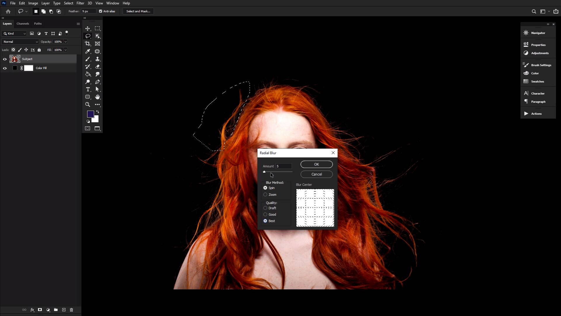 Welcome back to The Ultimate Guide to hair in Photoshop. In our final lesson, we'll be looking at how to both reshape hair and add some extra movement. Now, as we already did earlier, you can see how adding more hair can add a ton of movement to a head of hair. However, it can be a long, arduous process. And sometimes you just want to add a little oomph to your subject's already existing hair, without piling on more, with all the extracting and blending and lighting and painting, and all that, quote-unquote, fun stuff. For this you want to look no further than your blur filters. And well yes, of course the movement blur filter will work just fine and is sometimes the absolute perfect choice. I actually tend to prefer the Radial Blur filter. For me, I just tend to feel it gives me a much more dynamic and natural feel. Let's grab a large chunk of hair. So, you can go smaller if you want, using the lasso tool with a medium-level feather. The feather will depend on the size of your image, but it is essential when it comes to stopping any weird harsh edges of blurred and then not blurred areas. So play around with the different settings, if needed. You can always apply the blur, do it, choose a better feather, reselect and try again. I'm a big fan of trial and error. Once you do have your selection, head on over to Filter Blur, Radial Blur. Make sure the method is set to a radial, and the quality is set to best. That's an easy one to miss. As for the amount, again, it will depend on your specific image. However, 5 is always a good starting point, I find. You can also repeat the effect to intensify the blur further. Try not to push it too hard or you'll end up with a schmear of what might have been hair at one point in time. This is my go-to technique for dynamic, flowing hair and while it is simple, it simply delivers, and no one's giving out extra points for over-complicating simple processes. And finally, there's a good chance you probably already know that the liquefy tool is the go-to tool for reshaping and altering bodies. But it is also a beast when it comes to reshaping hair. And one of my favorite tools in general. I love to use it to create big surreal or fantasy hair as well as using it to give my mermaids and underwater floating effect, all just by pushing and pulling with the liquefy brush. I don't play with any of the other brushes, and my settings tend to stay pretty much the same. You can, however, use the masking tool to freeze the areas you don't want to be affected by the pushing and pulling, which I do use very often. You don't want the face to become distorted while you're messing with the hair here. Other than that, I'll be honest, I don't have any real tips or tricks for the liquefy tool, other than what I am actually showing you. It is just a powerful hair editing tool. So I just had to make sure I covered it before saying my goodbyes, because it's time to wrap things up next time in the Ultimate Guide to Hair in Photoshop.