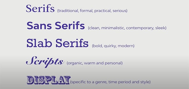 Now we'll take a look at the classification of typefaces. This will be a general overview of the different types of fonts. Remember to watch the full video lesson to learn about all the specific details.