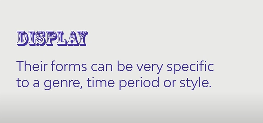 These fonts don't fit into any of the previous categories. They're one of the largest and most diverse categories. Display fonts aren't suitable for body copy and are often experimental. Some examples are graffiti fonts, tattoo fonts, fantasy fonts, and more.