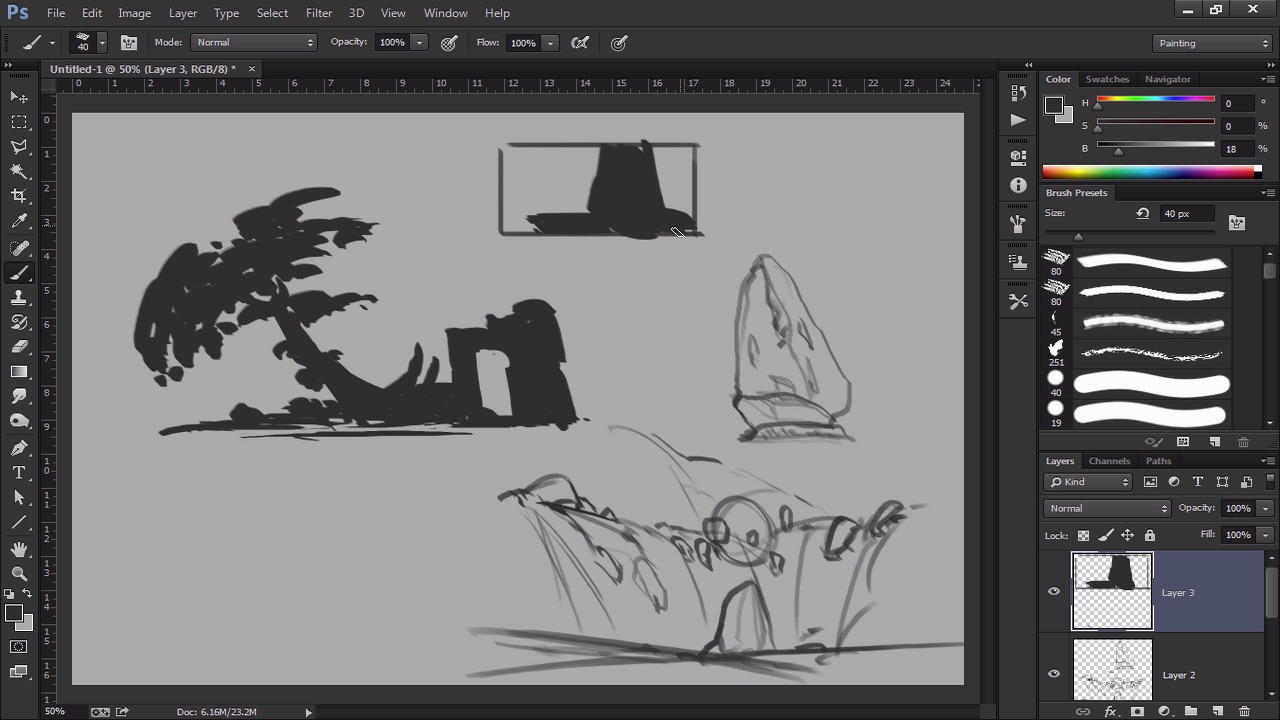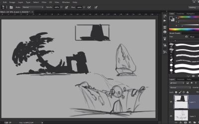 Okay, so let's get started with some exploration sketches just to get the brain going before we get into the thumbnail sketching. Before we kinda even go into that, let's just talk about Photoshop real quickly. I didn't talk about it before, but this is kind of Photoshop out of the package of what you see. You can customize it any way you want, it's really cool because you can always move around these kind of tabs, all that kind of stuff and customize it any way you want. So I highly encourage you at any point in time when you have some free time just to kind of tinker around in Photoshop a little bit and find a work space that works for you. So, by default, I use the painting one, depending on what you're trying to do. But painting is probably the best one, I think, because it has all my brushes right there, has the Layers, Channels, Path. All the things that I use on a daily basis and all my tools are on the right hand side. So, for right now we're probably just gonna use the brush tool. So, I'll give you guys my brushes so you guys can have those. I do have a lot of them and I apologize in the beginning. But as an environment guy you need a lot of brushes to save you time. But for the most part, I'll probably just be using like this brush and this brush, now nothing too crazy. Okay? If you don't know how to upload brushes, it's very very simple. All you have to do is just go to the brush option, click on your style list. And then you can just go right here in this little cog or the dialog box and then just go to load brushes, find the file and there you go. So let's get started, I'm just gonna start drawing anything and everything. You know? And so this is gonna be all over the place. And so you wanna think of this as a sketch book, it doesn't really matter if you're thinking in lines, thinking in value. It does not matter, if anything just start moving. I think that's probably the biggest thing that I see students kinda get caught up in. They're just like, what do I do, what do I do? Just start moving, just start thinking of something and just start going. Doesn't matter if it's cool or not, just again, start moving, start getting the brush going, and eventually things will figure itself out. And luckily I had some of that inspiration so now if I like something, I have kind of a good idea where it came from. So maybe there's like a bit of a architecture here. I'm just kind of erasing, so, I like to erase a lot because it kind of paints negatively too when you use the eraser tool. So you get some of these weird things that happen. So I'm just imagining this is kind of like a tree or something. All right, that's cool. And then maybe, So I'm just painting these little again just think of it like a sketchbook. You're just writing ideas out, that's all you can really do at this point. And I'm just kinda going here. So I have no idea what it could be, if it's even cool or not, but again, this is for me. Again, most of the time actually, I don't even show people these things because they're so rough. But again, it's very imperative for me to get to the final result. Otherwise, if I just kinda go for a final painting right off the bat, it's very unlikely. So the cool thing about this too is that I can always move this around and I can start something completely new. It doesn't really matter, so let's actually do that. Let's start something new and maybe this time, I'll use lines. So I'm gonna use a brush that's kind of better for lines and I'm just gonna start drawing something. And again, that's kind of the cool part about Photoshop or what I kinda wanna get across in this class is just the freedom just to do whatever you want. I don't want you guys to feel constrained or feel like you have to do it my way, that's totally not the case. You can do it the way that definitely fits you. My job is to just kind of show you different ways to approach it and then you guys can kind of pick the best one that suits you. So there's definitely no right or wrong answer to all this stuff, you know what I mean? So I'm thinking of like a rock and there's a waterfall and there's some kind of floaty thing around it. And again this could be a bad sketch. It could be a crappy sketchy. It could be a good sketch. I have no idea, because I didn't plan it. And that's the beauty of it, is that we're just letting our brain just work. And so we already looked at some reference. We already looked at some inspiration and so now we're just gonna just let that happen, so there you go. And maybe, this idea right here, I kind of want to think about that some more. So maybe I can go in here and think about that sketch a little bit more in detail. So now I'm kind of just sketching it a little more just so I can understand it better. And again just kind of sketching some ideas out, nothing too crazy. And even sometimes I'll even put a bounding box on mine. So, that's a kind of cool idea, but not really. I even put a bounding box on mine sometimes just to kind of help me understand where is it gonna be at the composition. So again, if you're having trouble, just work small. If if it's not working out for you just work very, very small. If you can work small and keep it to like two or three values in between, it's gonna make your job a lot easier. So notice here how small I'm working, is because I'm trying to figure some things out so I only have a couple of different values. And so if I can kind of make this read right in this small small little sketch, when I go into that thumbnail it should be a lot easier. So it's exactly what I'm banking on here, so you'll see me do a lot of these. It's probably one of my favorite ways to design, is think of small little thumbnails like this. And it kind of this helps me get some ideas up and I'm just thinking about the form the composition. And then sometimes, if I want to, I can go back in here later on and then really kind of design some things out. And so notice I jump around a lot as w