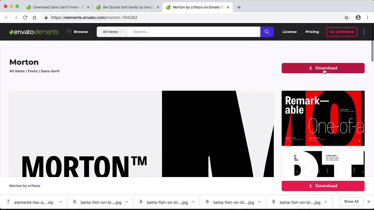 Hi everyone, welcome back to this course. Let's kick things off by looking into the creative process of designing a typographic poster. In this lesson, we will take a look into finding inspiration, finding fonts, and creating a headline for our poster. We are on the Envato Elements website, and this is a great library that is updated weekly with really good quality images, fonts, videos, and templates. So let's take a look at the photo section, and we can already see that they have themed collections. And our aim right now is to look for any kind of images that jump to our eyes. So I see a lot of color in the Seascapes collection. I'll go into that, and like I mentioned, we just need to scout for images that are interesting to us. For example, I find this image here interesting. And what I find interesting about it is the color and the strings are floating away. So for me it's very, this image is very pleasing, so I will download it. And the great thing about the Envato Elements website is that you can download images without a license to comp them first or try them on, on your project. And once you decide to use them, you can license them. So let's go back into the section here. And let's keep finding images. Now, there's no such thing as too many images or the right or wrong images. I believe that the more images that you can get, the more your creativity can expand because you can see what the possibilities are. So I'll get as many images as I can in different varieties. Now, in the real world, you would usually get a creative brief from your client. And this is where you would get some information and some inspiration from for the poster. But because we don't have that, this is a fictional poster. So we are our own client and we get to make those decisions. The great thing is that we can push the envelope as far as we want. So let's keep finding some more images. So let's take a look at what kind of images we've collected. And we have a theme going on, which is great. We have a lot of color, a lot of movement, and seascape. So to find a font, we need to keep these things in consideration because we don't want to use a font that is clashing with our images. So let's go into the font section. And let's take a look, At what we've got. So something like this, or this, would have too much personality. And we want to find something neutral, so maybe let's take a look at the sans-serif category and see what we can find. Fonts like this are perfect because they come across as friendly because they're rounded. So let's download this. Without a license and let's go back. Something like this would also be great mainly because it's just a neutral font, a traditional classic font that will blend well with our poster. So let's download that one as well. And the great thing about here is that you can go into the designer's other fonts, and I'm already seeing something that I like, and that would be this. I like the disruptive alternates. And the alternates would be a second option to a character. So for example, this is a regular H, and this will be its alternate. Or for example, here is the E, and this will be its alternate. So I think this would work great for our poster because it gives us more room to play. Let's download that one as well. And let's take a look at what we have. So we have many images, and we have about three fonts here that we can work with. The way I like to tackle the headline is, I look at all the images that I have and think of the words that I could come up with to describe them. And we can go into our browser and type fish synonym. Or we can even type fish and the meaning. Even though we already know the meaning of the word, it's good to read and see what other words are related to it. So for example here, catch, we try to catch. Concealed, search. Thesaurus and dictionary.com are really good options for this because it just gives us so many words that we can play with for a headline. So let's go into the dictionary.com. And this doesn't have to be anything complicated. Sometimes just the simplest words can lead us to something really good. And I can already see something that's calling my attention, and that would be aquatic. And something helpful to do is to visualize the word on a poster to see how the forms are going to look like the letter forms. Nautical is another great word. So let's try to go with aquatic, and there is no right or wrong here. You can go for, really, any headline that will make sense for the poster. So I see aquatic, I see life, I really like the word life. And let's go back here, and we have lots of life and movement and color. We can use aquatic, aquatic life in color, aquatic life in motion would also be great because there is so much movement with the fish. So let's go with that. Let's try to go with aquatic life in color, or aquatic life in motion. I think we have two great options there. We have a really good selection of fonts, images, and a couple of headlines. In the next lesson, I will show you how to go about the process of elimination to choose the right elements for our poster. I'll see you there.