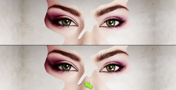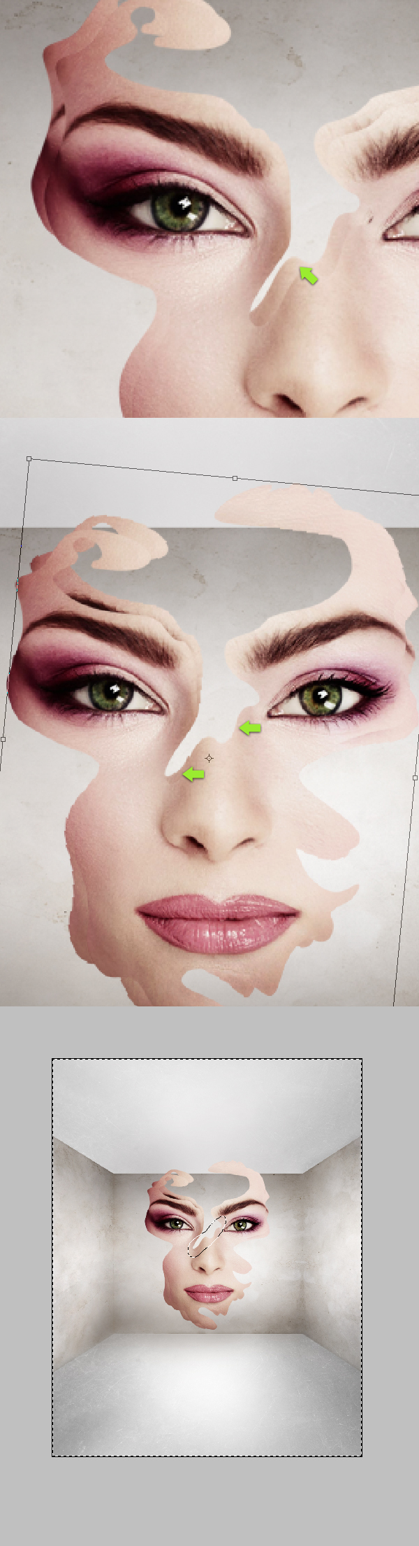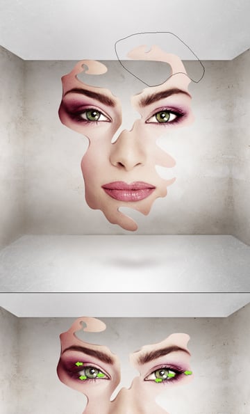 Noch mehr Abwechslung und weniger ebene Ergebnisse erzielen Sie, wenn Sie diese Fläche drehen (zweites Bild unten). Nehmen Sie dann das Lasso-Werkzeug und treffen Sie eine Auswahl um den angezeigten Teil über der Nase, drücken Sie Befehl + Umschalt + I, um die Auswahl umzukehren (drittes Bild unten) und verwenden Sie Löschen, um alle unerwünschten Teile zu entfernen.