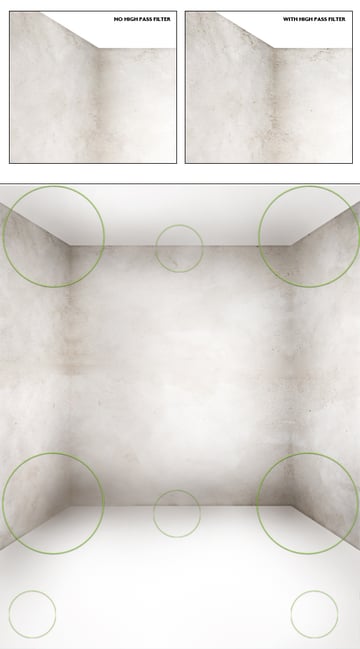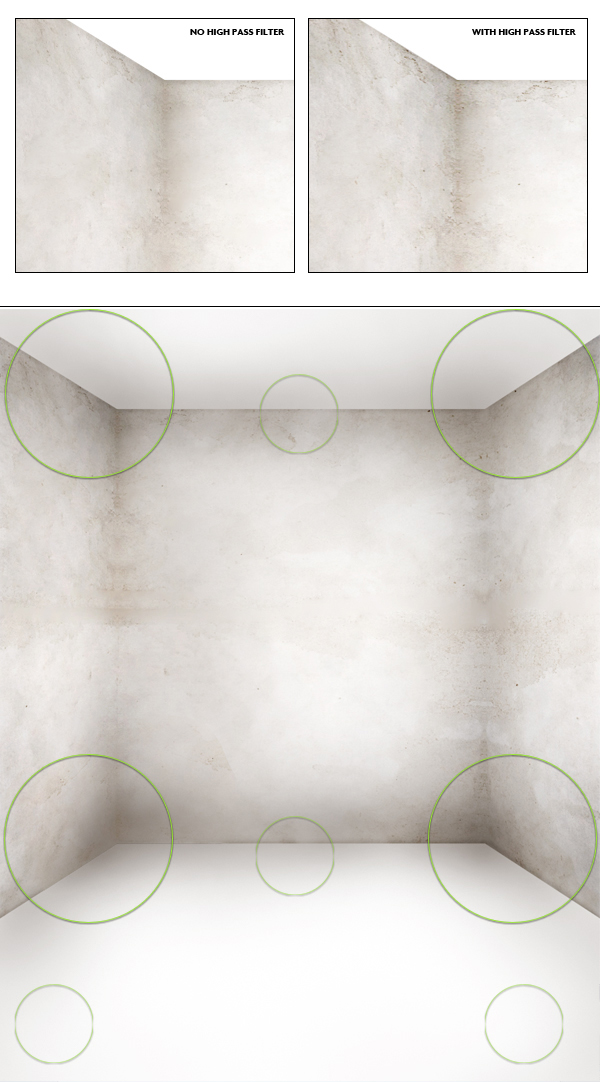 Ich gehe davon aus, dass Sie alle Ihre Wandschichten zusammengeführt haben, um die Arbeit zu erleichtern. Wenn nicht, machen wir es jetzt. Dann duplizieren (Befehl + J) die Ebene "Wände" und ändern Sie ihre Deckkraft in Überlagerung. Gehen Sie nun zu Filter > Other > High Pass und fügen Sie den Wert 1 oder 2 hinzu. Sie sollten sofort das im ersten Bild unten gezeigte Ergebnis erhalten.