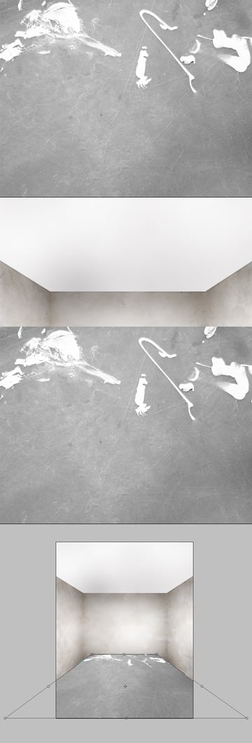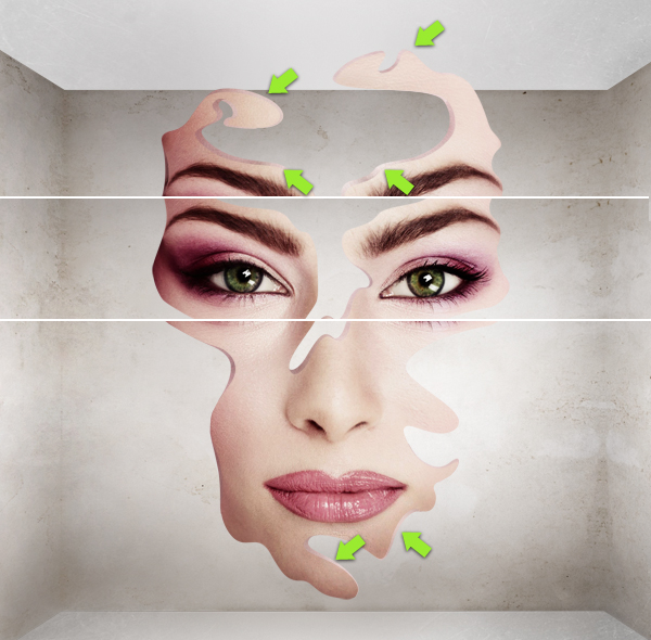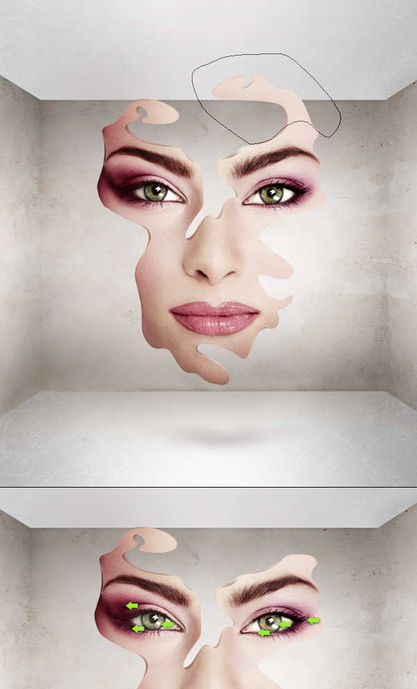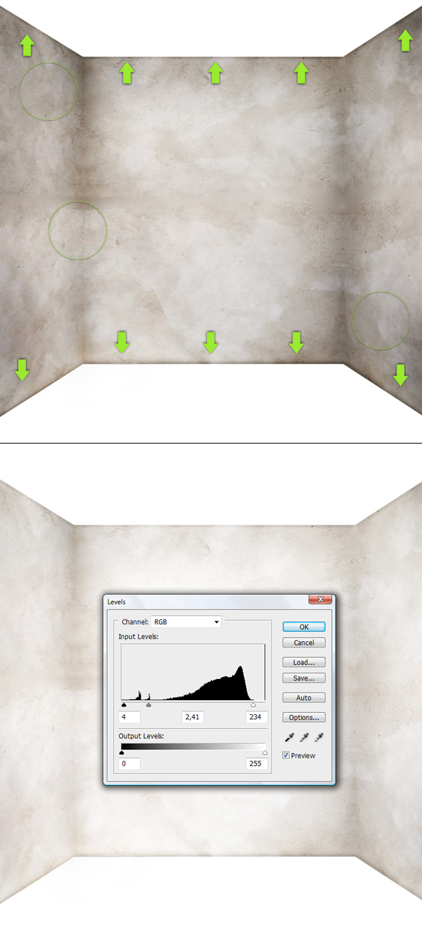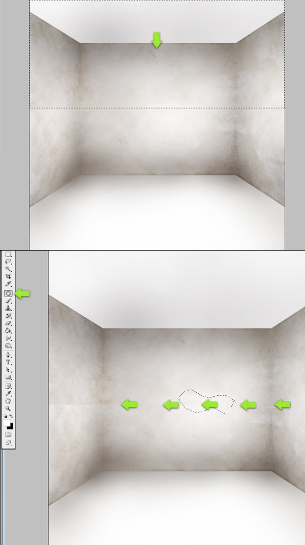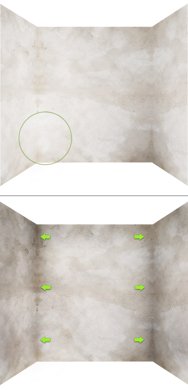 Wählen Sie die zusammengeführte Ebene (die mit der gesamten Leinwand) und verwenden Sie das rechteckige Auswahl-Werkzeug, um den oberen Teil des Bildes auszuwählen, halten Sie dann die Befehlstaste gedrückt und ziehen Sie diesen Teil nach unten. Dies wird uns helfen, die Perspektive zu reparieren, da wir sie am Anfang ziemlich zufällig gemacht haben (wenn Sie sich das vorstellen können, sollten sich die diagonalen Wandlinien in der Mitte des Bildes kreuzen). Betrachten Sie als Nächstes das zweite Bild unten und verwenden Sie das Ausbessern-Werkzeug, um die durch die Pfeile angezeigte gerade Linie zu entfernen (die ein Ergebnis der Reparatur der Perspektive ist).