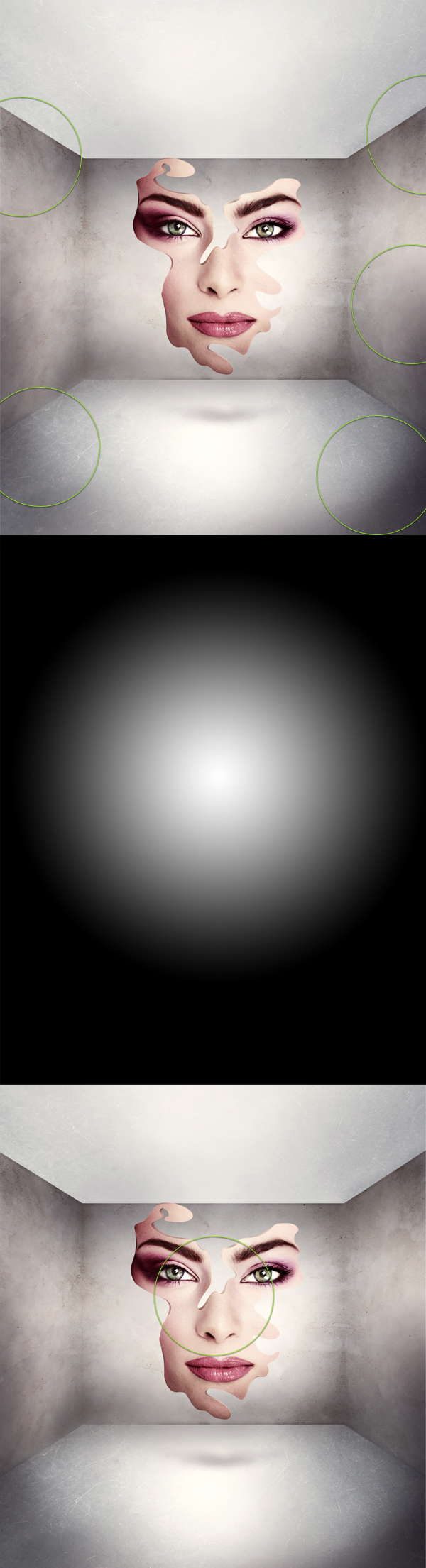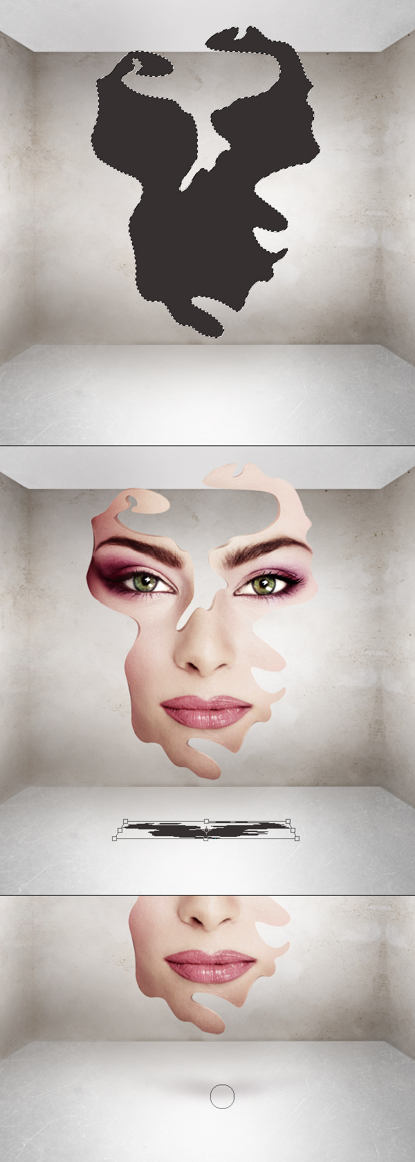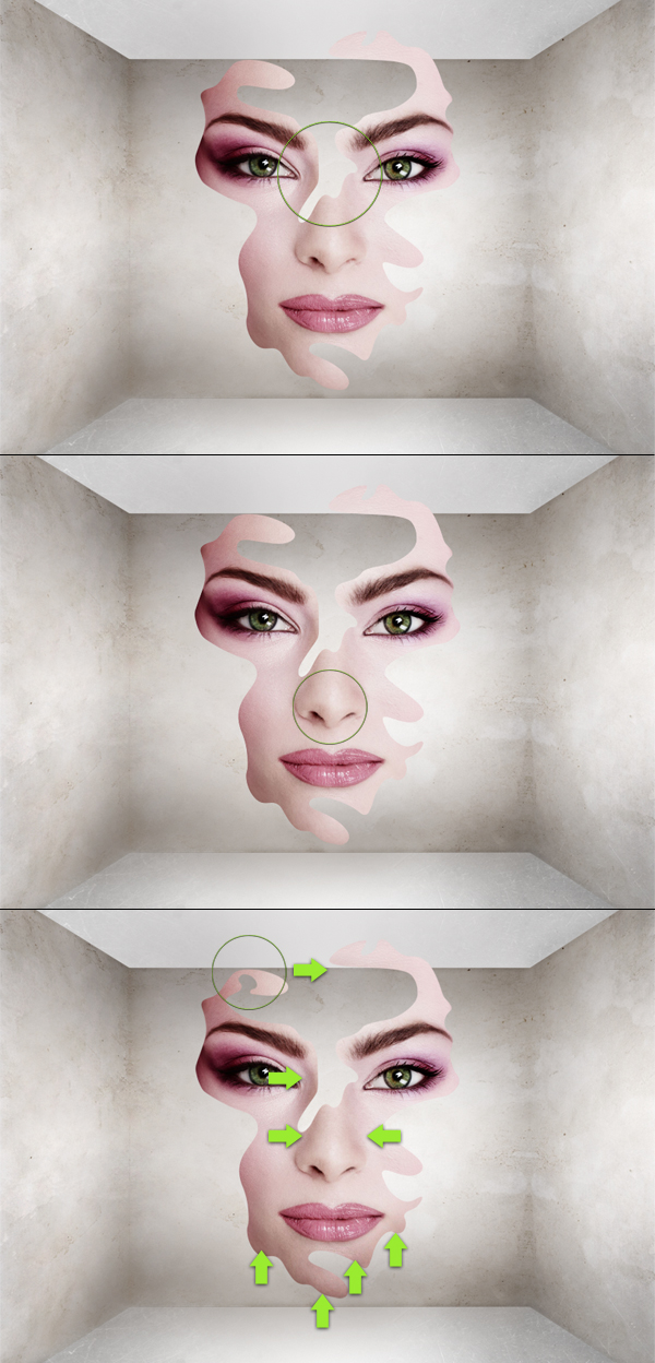 Verwenden Sie dieselbe Technik aus dem vorherigen Schritt, um die Deckenfläche zu erstellen. Öffnen Sie nun das Gesichtsbild. Schnappen Sie sich jetzt das Radiergummi-Werkzeug, das auf 100% Härte und 100% Fluss eingestellt ist, und entfernen Sie die umgebenden Hautblumen. Ein genauer Ausschnitt ist nicht notwendig, da wir in den folgenden Schritten die Gesichtsform bearbeiten. Vorerst müssen wir auch dieses Gesicht verkleinern, damit es besser zur Illustration passt (drittes Bild unten). Alles braucht seinen Platz in einem hochwertigen Stück, lassen Sie Ihr eigenes Auge die Proportionen beurteilen.