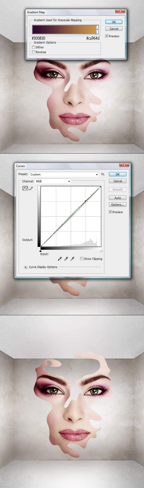 Das Gesicht wirkt irgendwie blass, also wärmen wir es ein wenig auf. Wählen Sie die Ebene "Gesicht", halten Sie die Alt-Taste gedrückt, gehen Sie zur Ebenenpalette und wählen Sie Verlaufskarte (aktivieren Sie die Option Vorherige Ebene verwenden, um Schnittmaske zu erstellen). Schauen Sie sich das erste Bild unten an und verwenden Sie ähnliche Farben wie meine. Wählen Sie die Ebene Verlaufskarte aus, ändern Sie den Mischmodus in Weiches Licht und verringern Sie die Deckkraft auf etwa 20-30% (um das Gesicht nicht mit Farbe zu überladen). Verwenden Sie dann erneut Alt, fügen Sie eine weitere Einstellungsebene hinzu, nämlich Kurven, und passen Sie sie ein wenig an, um das ähnliche Aussehen wie im dritten Bild unten zu erhalten.