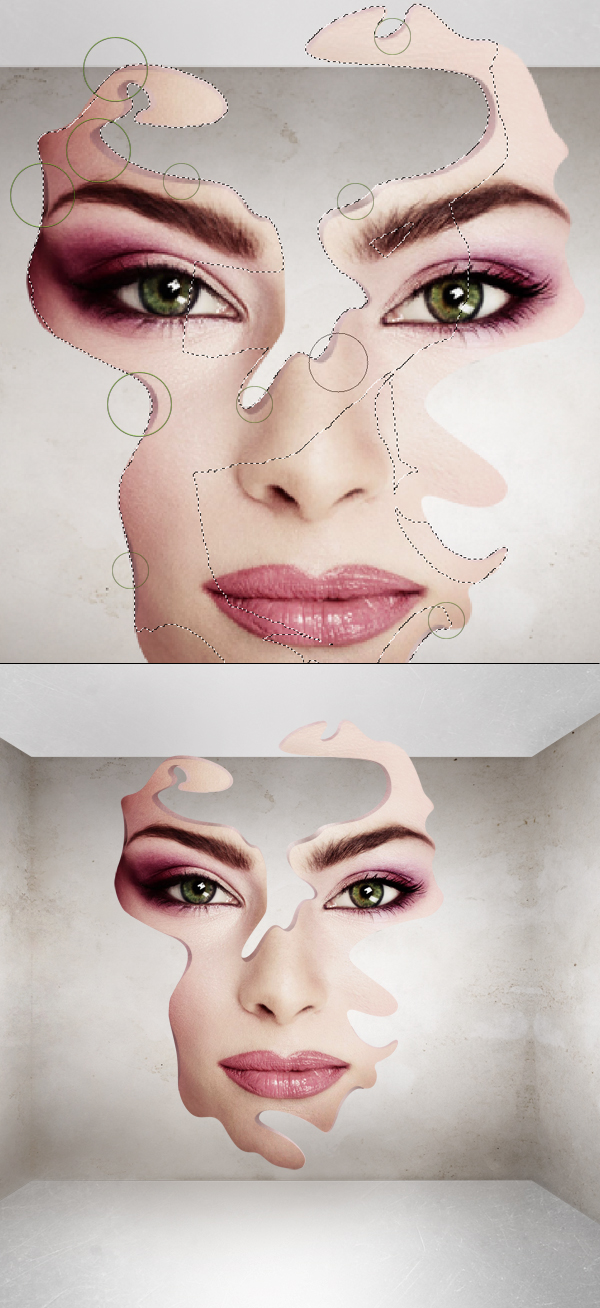 Jetzt formen wir dieses Gesicht. Schnappen Sie sich das Stiftwerkzeug und zeichnen Sie einen kurvigen Pfad um das ganze Gesicht. Achten Sie darauf, viele Hohlraumformen zu erstellen (absolut keine Quadrate). Wenn Sie fertig sind, verwandeln Sie den Pfad in eine Auswahl und drücken Sie Befehl + Umschalt + I, um die Auswahl umzukehren (erstes Bild unten), und drücken Sie dann Löschen. Jetzt sollten Sie etwas Ähnliches wie im zweiten Bild unten erhalten.