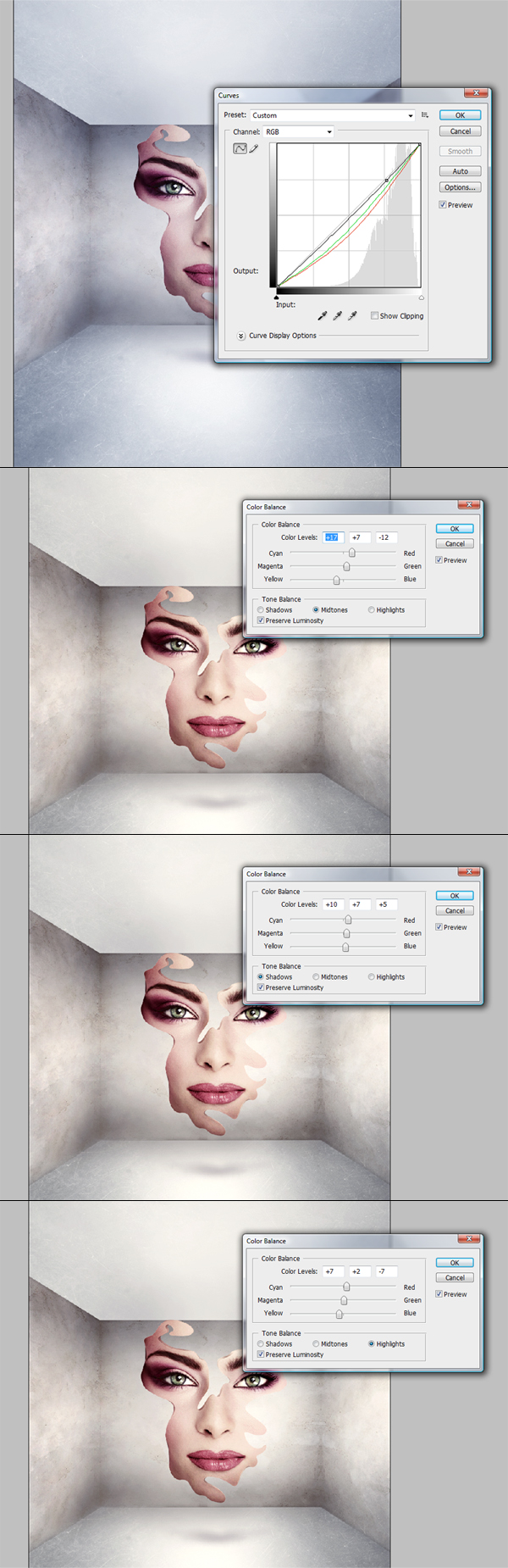 Fügen Sie nun oben in der Ebenenpalette einige weitere Einstellungsebenen hinzu. Wählen Sie zuerst Kurven und lassen Sie die Töne der gesamten Illustration ähnlich aussehen (als ob alles aus einem Bild stammt). Nehmen Sie dann mit der Farbbalance weitere Anpassungen vor, und im Grunde ist es die gleiche Idee. Füllen Sie es mit Ihren persönlichen Einstellungen.