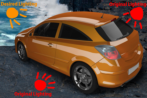 Lassen Sie uns nun die Beleuchtung des Autos reparieren. Basierend auf dem Diagramm der Beleuchtungsstärke werde ich eine Anleitung zur Erstellung der Beleuchtung des Autos bereitstellen. Beachten Sie, dass sich die ursprüngliche Beleuchtung des Bildes vollständig von der erforderlichen Beleuchtung unterscheidet.